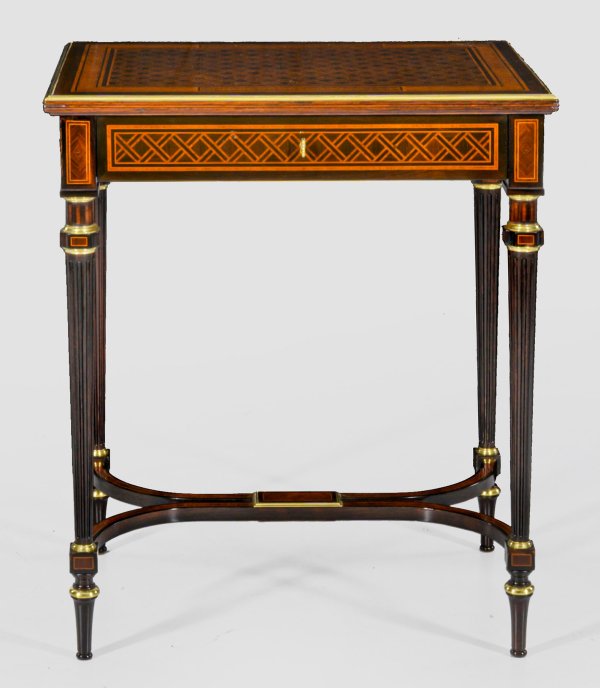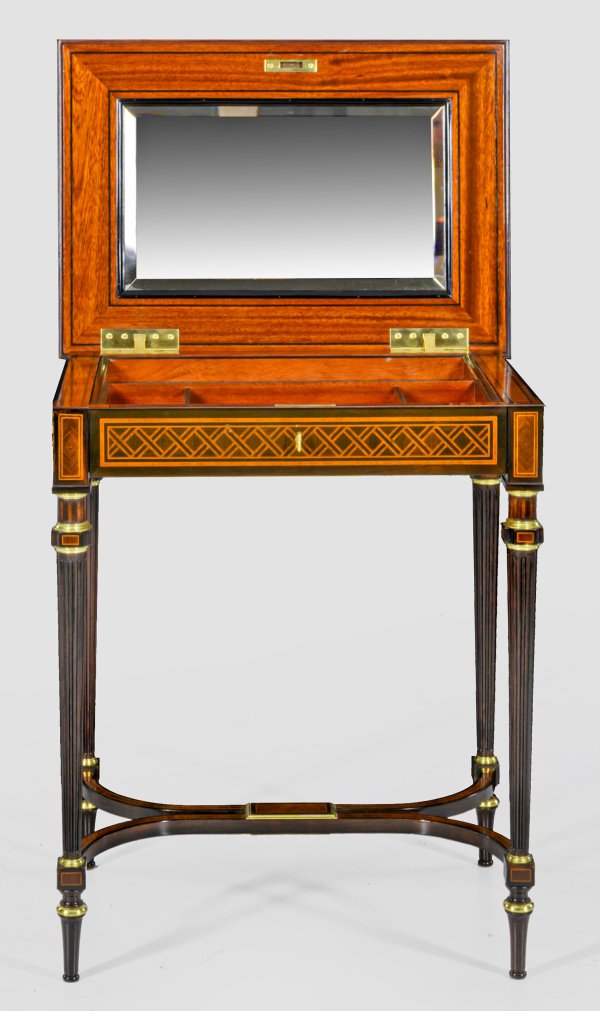Palisander und Rosenholz, furniert sowie Applikationen aus Messing. Gerader, einschübiger Zargenkasten auf schlanken, kannelierten Balusterbeinen, unterhalb durch gebogte Stege verbunden. Gering überstehende, profilgerahmte, aufklappbare Deckplatte. Unterhalb eingelassene, facettierte Spiegelfläche. Allseitig breit gerahmte aufwändige Furnierfelder aus Gitterwerk, von Bandeinlagen begrenzt. Schloss bez. "Vve.P.Sormani & Fils, Paris. 10 rue Charlet". H. 74 cm. 64 cm x 44 cm.