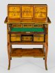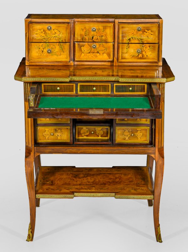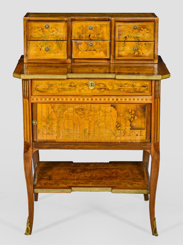 Palisander, furniert sowie Einlagen aus teilw. grün gefärbtem Ahorn. Gerader, rechteckig angelegter Korpus, flankiert von schräggestellten Ecklisenen auf hohen, geschweiften Beinen, unterhalb durch eingezogene Ablagefläche verbunden. In der gegliederten Front ausziehbare und abklappbare Arbeitsfläche sowie breiter Rolloverschluss. Dahinter jeweils Facheinteilung. Oberhalb weit zurückgesetzter, querrechteckig angelegter, sechsschübiger Korpus. Allseitig breit gerahmte Furnierfelder mit intarsierten Ruinenelementen, Attributen der Musik und unterschiedlichen Vasenmotiven, von Bandeinlagen begrenzt. H. 93 cm. 65 cm x 49 cm.