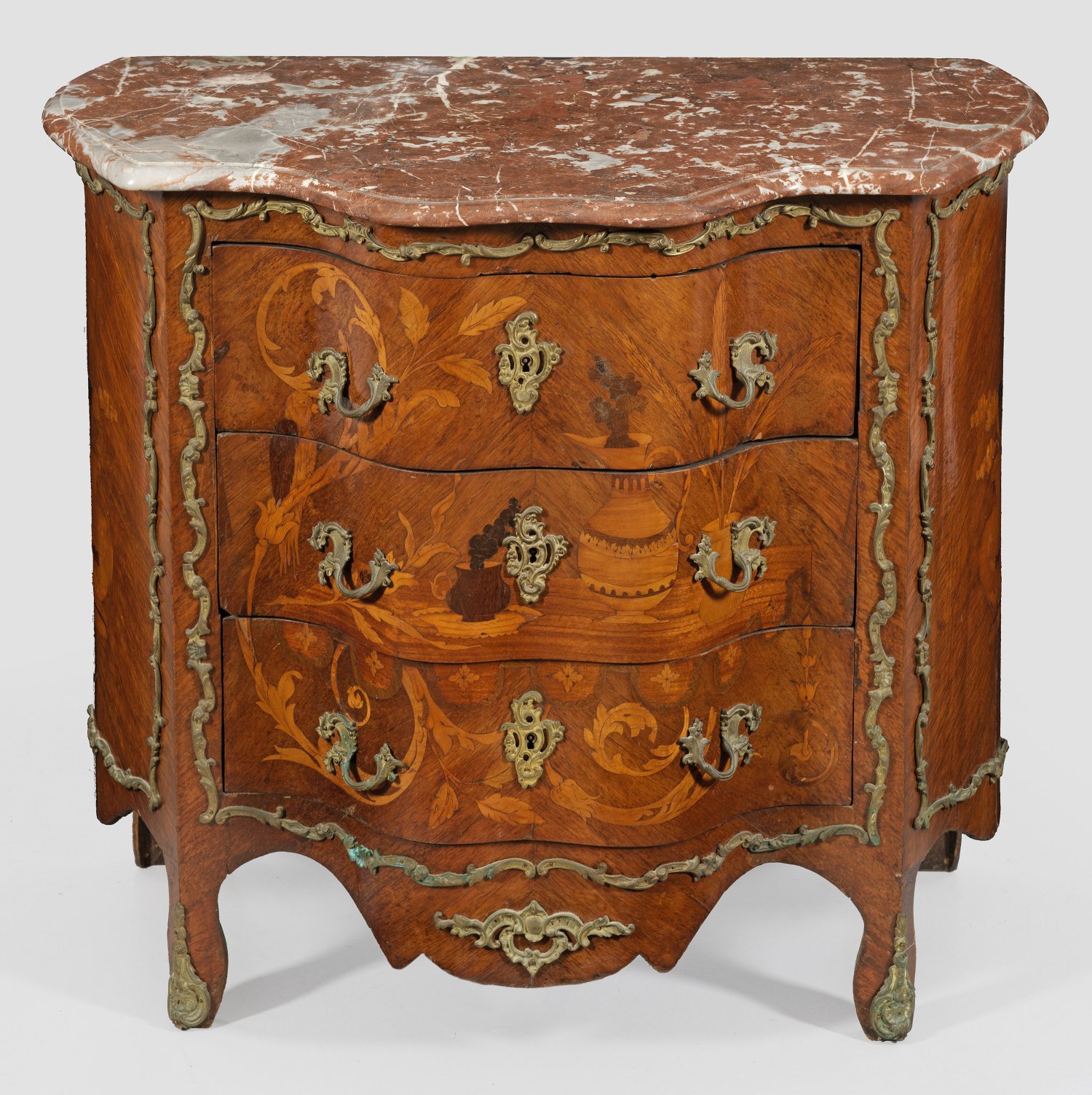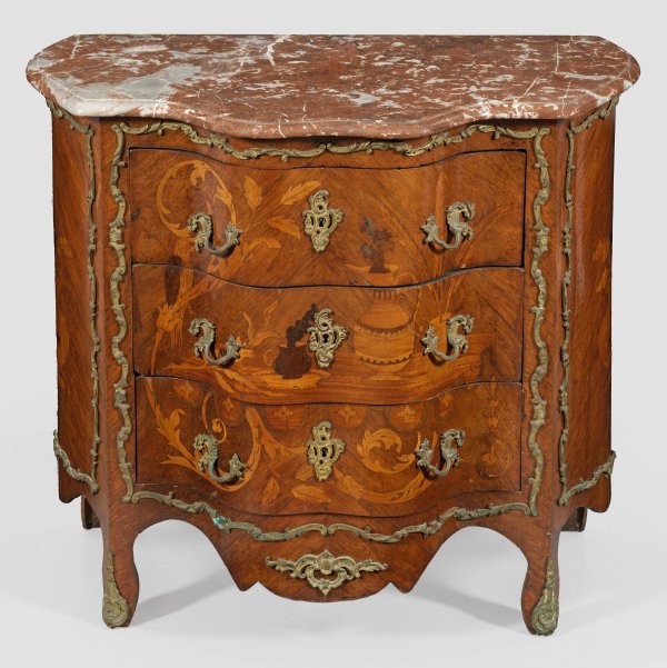 Nussbaum, furniert sowie Einlagen aus unterschiedlichen Hölzern. Dreiseitig bombierter Korpus mit gerundeten Ecklisenen, in entsprechende Beine übergehend. In der gegliederten Front drei Schubladen sans traverse, durch eingelegte Vasen- und Blattmotive verbunden. Applikationen aus Bronze, gering überstehende Deckplatte aus rotgemasertem Marmor. H. 76 cm. 86 cm x 45 cm.