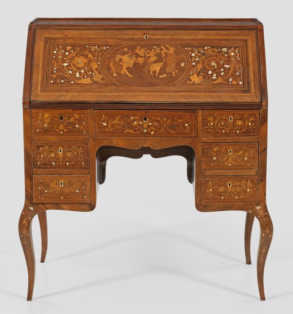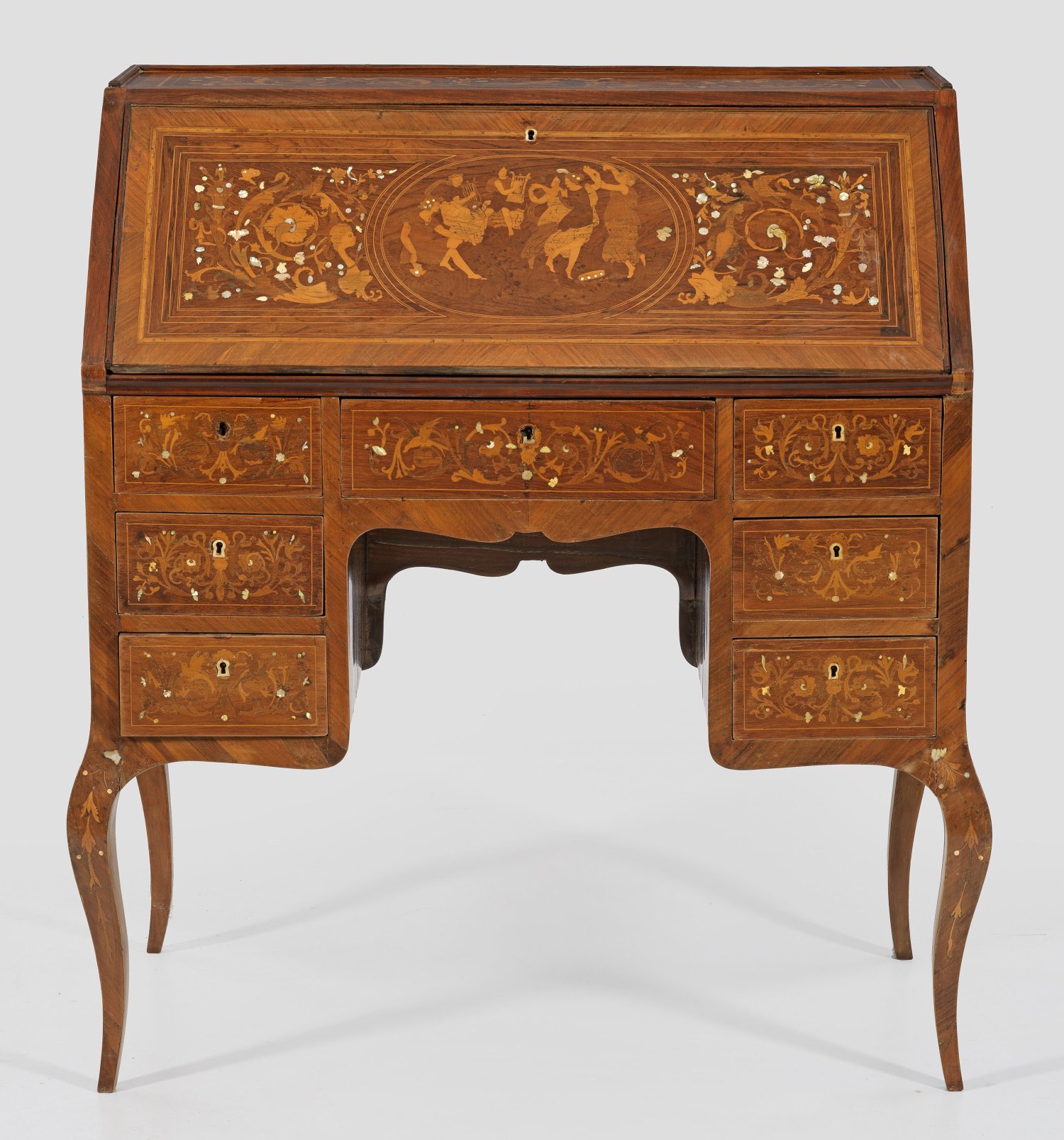 Nussbaum und Palisander, furniert sowie reiche Einlagen aus unterschiedlichen Edelhölzern, Perlmutt und Elfenbein. Gerader, rechteckig angelegter Korpus mit geschweifter Zarge auf geschwungenen Beinen. In der gegliederten Front Kniefach, umgeben von Schubfächern. Oberhalb schräggestellte, abklappbare Arbeitsfläche. Innen gestaffelte Facheinteilung. Allseitig flächendeckend breit gerahmte Furnierfelder mit intarsierten Bacchantenszenen, Putten und Vasenmotiven, sowie üppigen Blattvoluten und Blüten. H. 104 cm. 95 cm x 50 cm.