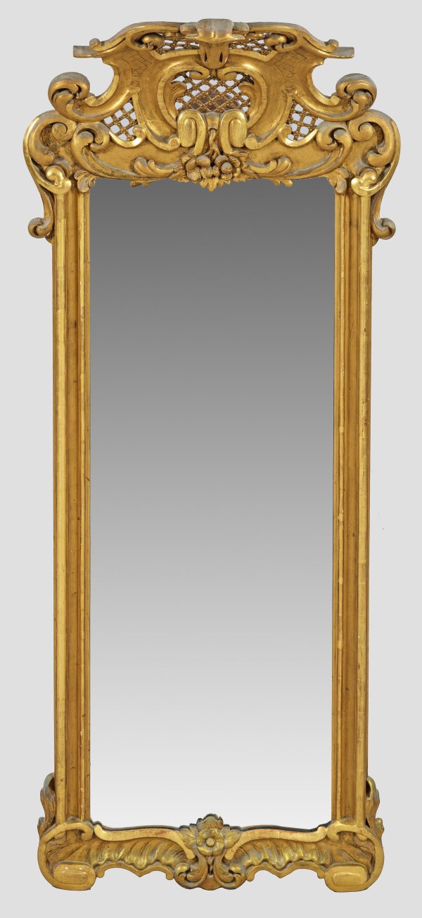Holz, stuckiert und vergoldet. Gerade, hochrechteckige, kräftig profilierte Spiegelrahmung mit stark vorkragender, durchbrochen gearbeiteter Bekrönung aus üppigen Volutenmotiven und Gitterwerk. Facettiertes Spiegelglas. 210 cm x 85 cm.