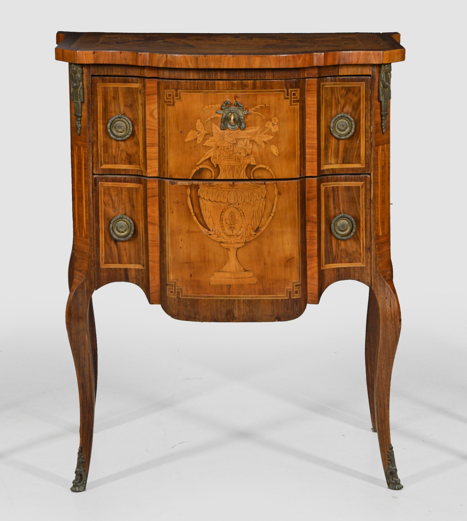 Nussbaum, Palisander und Ahorn, furniert. Gerader, rechteckig angelegter Korpus, flankiert von schräggestellten Ecklisenen, auf hohen, geschwungenen Beinen. In der gegliederten Front zwei optisch verbundene, geschweifte Schubladen sans traverse. Gering überstehende Deckplatte. Flächendeckend breit gerahmte Furnierfelder sowie intarsierte Blüten- und Vasenmotive. H. 88,5 cm. 74 cm x 43 cm.