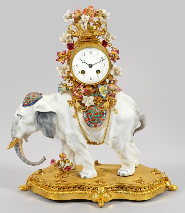 Porzellan, polychrom staffiert sowie Messing, vergoldet. Über passig geschweiftem, durchbrochen gearbeitetem Sockel vollplastische Darstellung eines Elefanten mit dekorativer Satteldecke als Träger für rundes Uhrengehäuse. Üppiger Dekor aus sog. Vincennes-Blüten. Verglastes Emailzifferblatt. Werk mit Echappement sowie Halbstundenschlag auf Glocke. H. 40 cm. 36 cm x 21 cm.