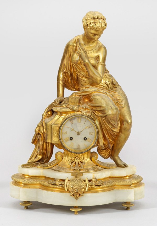 Bronze, vergoldet und cremefarbener Onyx. Über gestuft ansteigendem Profilsockel vollplastische Darstellung einer jungen Dame mit Schatulle auf dem Uhrengehäuse sitzend. Verglastes Zifferblatt, undeutlich bez.; Pendulenwerk mit Pendelfeder sowie Halbstundenschlag. Pendel und Glocke fehlen. H. 51 cm. 36 cm x 17,5 cm.