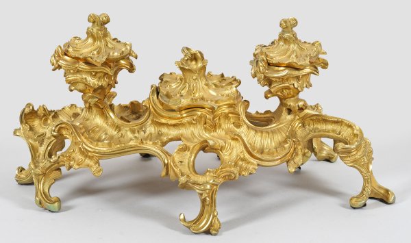 Bronze, vergoldet. Durchbrochen gearbeiteter asymmetrisch angelegter Korpus aus üppigen Rocaillen auf entsprechenden Füßen. Korrespondierende Behältnisse für Tinte und Streusand mit Glaseinsätzen sowie mittig aufklappbares Ablagefach. H. 22 cm. 47 cm x 27 cm.