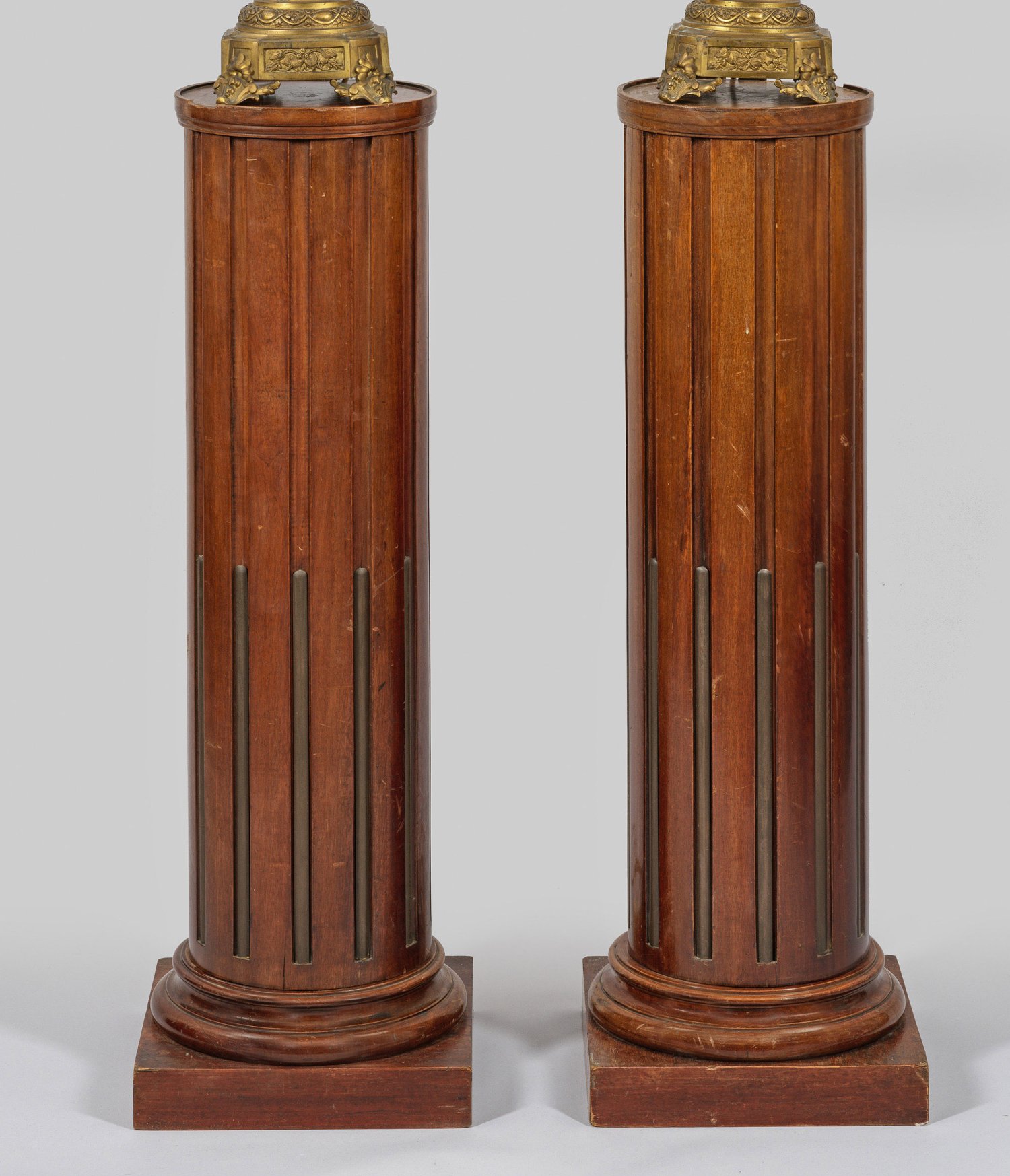 A pair of French mahogany veneered pillars.