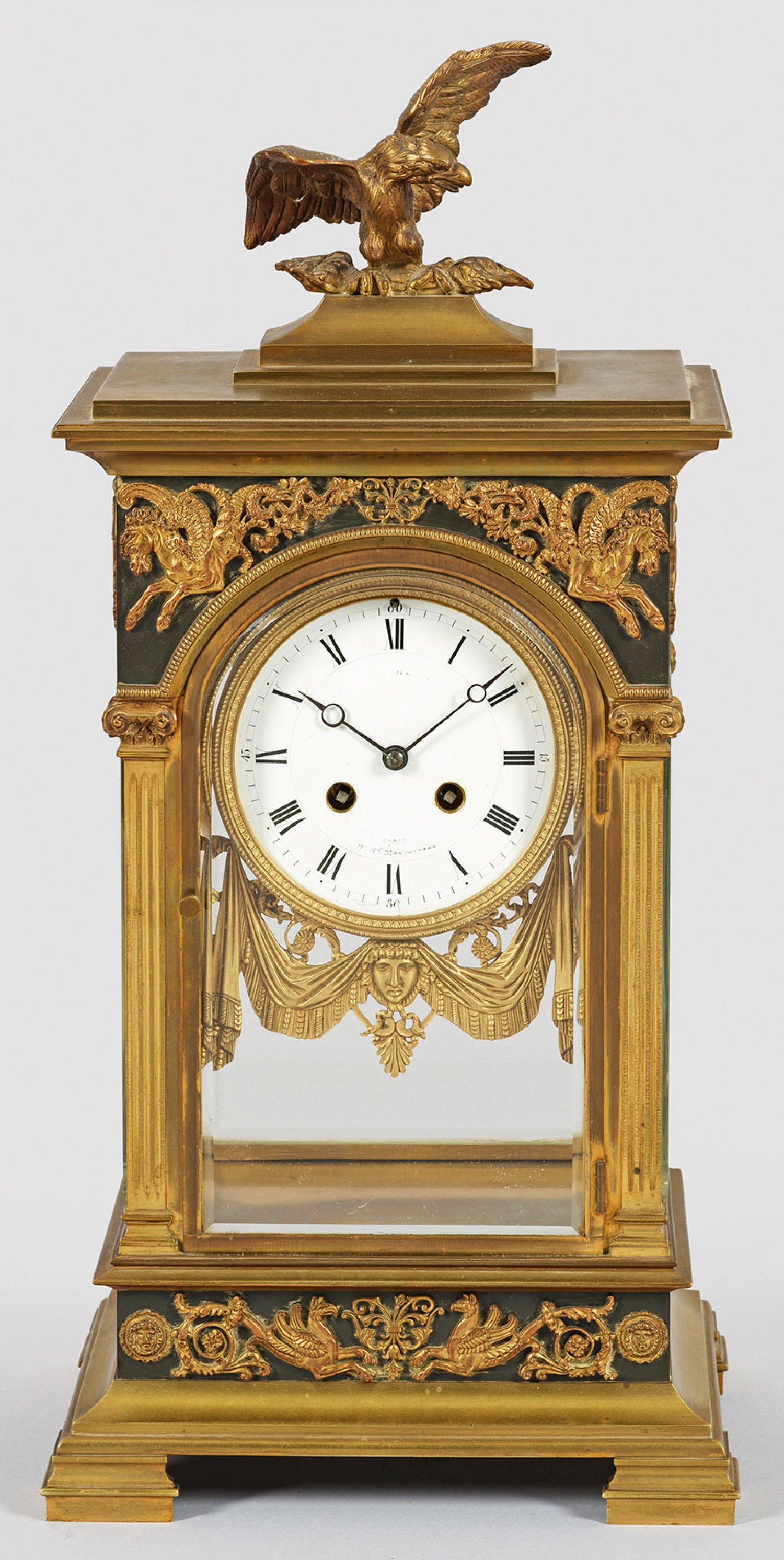 Messing und Bronze. Hochrechteckiger, architektonisch gegliederter, allseitig facettverglaster Korpus, flankiert von kannelierten Pilastern auf gekehltem Profilsockel. In der Front erhaben reliefierte Chimären und Pegasoi. Vollplastische Adlerbekrönung. Emailzifferblatt undeutl. bez. und unw. besch.; Pendulenwerk mit Pendelfeder sowie Halbstundenschlag auf Glocke. Pendel fehlt. H. 50 cm. 24 cm x 17,5 cm.