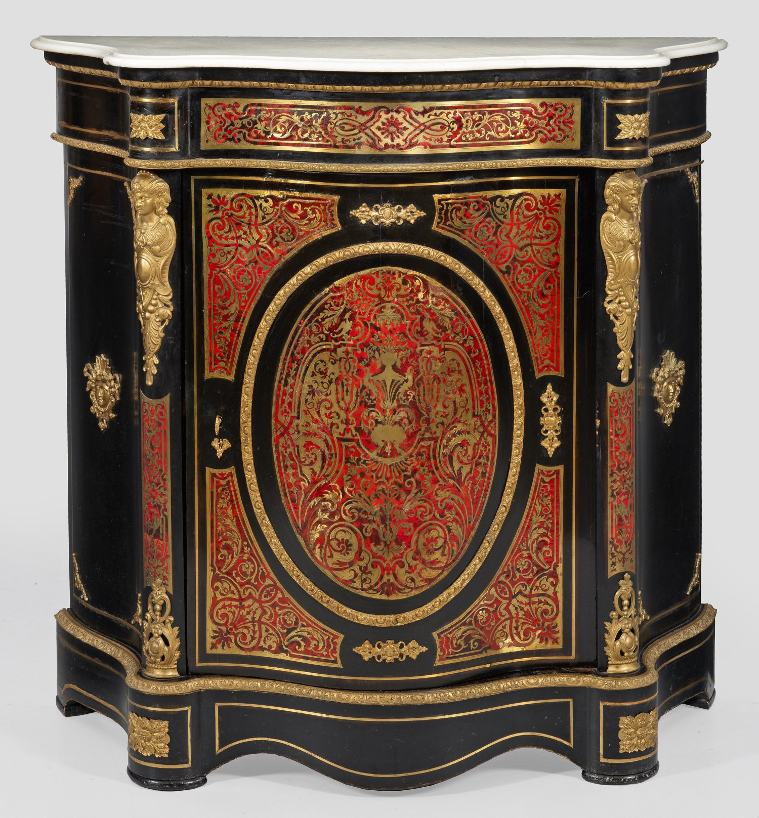 Holz, ebonisiert mit Einlagen aus ornamentiertem Messing und rot hinterlegtem Horn in sog. Boulle-Technik. Dreiseitig bombierter, eintüriger Korpus, flankiert von gerundeten Lisenen mit plastischen Karyatiden auf geschweiftem Zargensockel. Flächendeckend breit gerahmte Felder aus Rankenwerk. Gering überstehende Deckplatte aus weißem Marmor. H. 106 cm. 110 cm x 43 cm.
