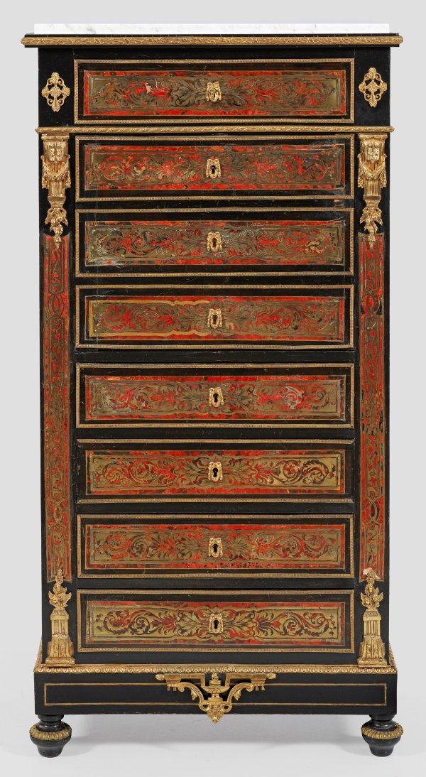 Holz ebonisiert sowie flächendeckende Marketerie aus ornamentiertem Messing und rot hinterlegtem Horn in sog. Boulle-Technik. Applikationen aus vergoldeter Bronze. Gerader, hochrechteckiger Korpus auf flachem Zargensockel und Balusterfüßen. In der gegliederten Front fünf Schubladen sowie abklappbare Arbeitsfläche mit korrespondierenden Blendschubladen. Dahinter gestaffelte Facheinteilung. Profilgerahmte Deckplatte aus weißem Marmor. Flächendeckend breit gerahmte Reserven aus reichen Volutenmotiven. H. 136 cm. 70 cm x 35 cm.