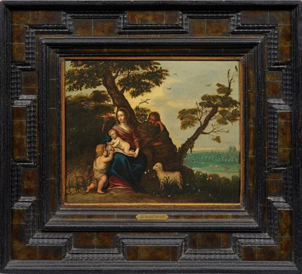 Der Betrachter blickt auf eine idyllische, waldreiche Landschaft, in deren Vordergrund die unter einem großen Apfelbaum ruhende Hl. Familie mit dem Johannesknaben und ein kleines, weißes Lamm (als Agnus Dei), das zum Johannesknaben schaut. Der unbekleidete Jesusknabe auf dem Schoß Mariens wendet sich dem vor ihm knienden Johannesknaben zu und nimmt von ihm einen Apfel entgegen, als Symbol künftiger Erlösung von der Erbsünde. Zu den Füßen des Johannes, der ein Fellgewand trägt, liegt als Attribut ein Kreuzstab am Boden. Zu der fast paradiesischen Anmutung der Landschaft passt der hinter Maria und dem Kind im Gebüsch sitzende, leuchtend rote Ara sowie weitere Vögel am Himmel und in den Ästen eines weiteren, diagonal in den Himmel ragenden Baumes, außerdem die Weide im Hintergrund, auf der friedlich Kühe grasen. Das um 1640, in fein lasierender Malerei geschaffene Werk entstand, wie im 17. Jh. in Antwerpen üblich, in kongenialer Zusammenarbeit von zwei herausragenden Malerspezialisten verschiedener Gattungen. Während die Landschaft, die Blumen und Vögel von Jan Brueghel d. J. geschaffen wurden, stammt die Figurengruppe mit dem Lamm von Pieter van Avont. Der älteste Sohn Jan Brueghels d. Ä., erhielt seine fundierte künstlerische Ausbildung im Atelier des Vaters und in Italien; 1625 übernahm er dessen Werkstatt und arbeitete als bedeutender Landschaftsmaler oft mit bedeutenden Malern wie Peter Paul Rubens und Hendrick van Balen zusammen, die seine Gemälde mit Figuren staffierten. Zum Kreis bekannter Künstler, die er ebenfalls heranzog, gehörte auch Pieter van Avont, ab 1622 in der Antwerpener Malergilde. Jan Breughel d. J. hat das Thema der Hl. Familie bzw. Maria mit Jesus und Johannes, der Ruhe auf der Flucht nach Ägypten, aber auch nur der Muttergottes in Landschaft mehrfach gemalt, sowohl in Zusammenarbeit mit Hendrick van Balen als auch Pieter van Avont. Vergleichbare Werke Brueghels und van Avonts befinden sich im Kunsthistorischen Museum in Wien. Auch im Oeuvre Pieter van Avonts gehörte dieser Themenkreis zu den wichtigsten Darstellungen. Öl/Kupfertafel. L. u. sign. "I. Breughel". 30 cm x 37,5 cm. Rahmen.