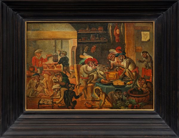 Vielfigurige, szenische Darstellung der teilw. in grotesker Manier als Menschen verkleideten Affen. Das Gemälde gehört durch sein Affen-Thema zu der eigenen Bildgattung der sog. "Singerie", abgeleitet von dem französischen Wort für "Affentrick" bzw. "Singe" (Affe). Hierbei werden Affen geschildert, die menschliches Verhalten nachahmen und oft modisch gekleidet sind, wodurch sie einen mehr oder minder starken satirischen Einschlag zum Ausdruck bringen. Die komischen Szenen mit Affen in menschlicher Kleidung und Umgebung entstanden als Gattung in der flämischen Malerei des 16. Jhs., die im 17. Jh. weiterentwickelt wurde. Der flämische Künstler Pieter van der Borcht führte die Gattung um 1575 in einer Reihe von Drucken ein, die in der Tradition von Pieter Bruegel dem Älteren standen. Diese Drucke wurden vielfach beschrieben, später wurde das Thema von anderen flämischen Künstlern wie Frans Francken dem Jüngeren, Jan Brueghel dem Älteren, Jan Brueghel dem Jüngeren und Sebastian Vrancx vor allem in Antwerpen aufgegriffen; Klaus Ertz schreibt in seiner Monographie zu Jan van Kessel dem Künstler ebenfalls eine Werkreihe mit Affendarstellungen zu. Sein Zeitgenosse David Teniers der Jüngere wurde einer der Hauptvertreter dieses Themas und entwickelte es zusammen mit dem jüngeren Bruder Abraham Teniers weiter, sie sorgten für die Verbreitung des populären Themas über Flandern hinaus. Öl/Holztafel. 23,5 cm x 35 cm. Rahmen