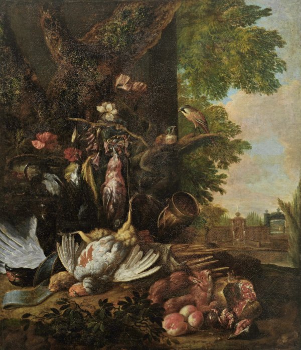 An einem moosbewachsenen Baumstamm arrangierte Beute aus verschiedenen erlegten Wildvögeln mit Jagdhorn. Oberhalb ein auf einem Ast sitzendes Vogelpaar, im Vordergrund ein Eichhörchen, das sich an einem Granatapfel, Feigen und Pfirsichen labt. Das fein gemalte, in der Tierschilderung genau beobachtete Barock-Stillleben lässt sich aufgrund des charakteristischen Motivs und Stils Weenix zuschreiben, der um 1700 oft in vergleichbarer Weise Jagdbeute vor einer Parklandschaft darstellte. Öl/Lwd., 102 cm x 87 cm. Rahmen.