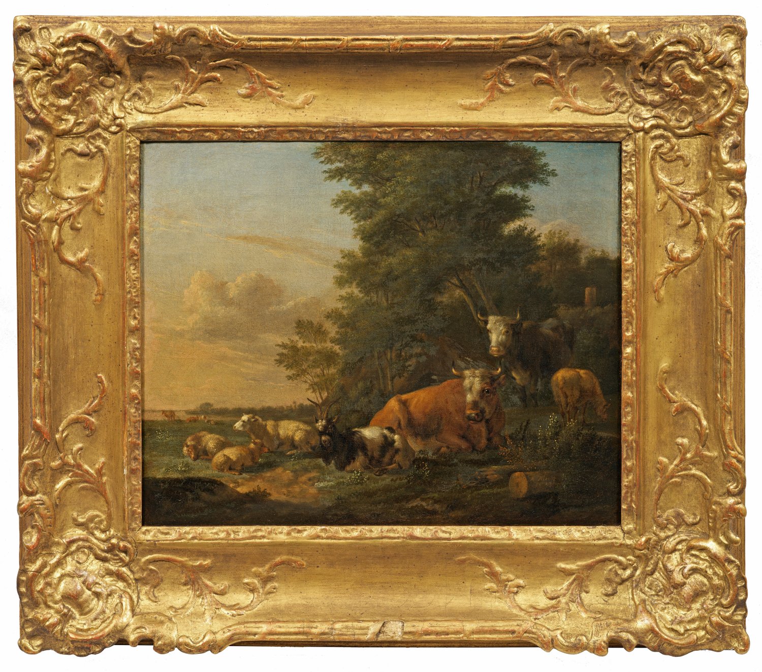 Motiv- und stiltypisches, für sein Oeuvre repräsentatives Werk Klomps, der ab ca. 1660 eine Reihe vergleichbarer atmosphärisch gestimmter Landschaften mit Weidevieh- und Hirtenmotiven schuf, die sich u. a. in Rijksmuseum Amsterdam befinden. Durch ihre künstlerisch qualitätvoll ausgeführten, sehr lebendig gestalteten Viehstaffagen reichen diese an Werke Karel Dujardins, Adriaen van den Veldes und Paulus Potters heran, mit deren gefälschter Signatur sie des Öfteren versehen wurden. Öl/Lwd.; R. u. sign. u. undeutl. dat.; 32,5 cm x 40 cm. Barock-Rahmen.