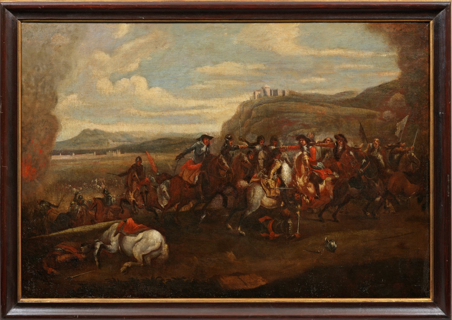 Vielfigurige, lebendige und dramatische Darstellung einer Schlacht, rechts im Vordergrund auf einer leichten Anhöhe ein tobendes heftiges Gefecht, zu dem von einer Talebene aus weitere Reiter hinzustoßen. Als Landschaftshintergrund eine befestigte Stadt und eine auf einem Bergrücken liegende Festung. Rugendas malte vornehmlich Schlachten aus dem Spanischen Erbfolgekrieg (1701-14), den zeitgenössischen Türkenkriegen sowie Lagerszenen. Er lernte 1682-1687 bei dem Augsburger Maler Isaak Fisches d. Ä., 1690-1695 war er in Wien, Venedig und Rom tätig. Nach seiner Rückkehr schuf er in seiner Augsburger Werkstatt eine Vielzahl von Gemälden und Kupferstichen, 1710 wurde er Direktor der neugegründeten Kunstakademie. Mit seinen Bataillendarstellungen und Pferdebildern gehörte er zu den begehrtesten Malern seiner Zeit, dessen Gemälde in zahlreiche Adelssammlungen gelangten und maßgeblich die Schlachtenmalerei des 18. Jhs. beeinflussten. Öl/Lwd., doubl.; 94,5 cm x 143 cm. Rahmen.