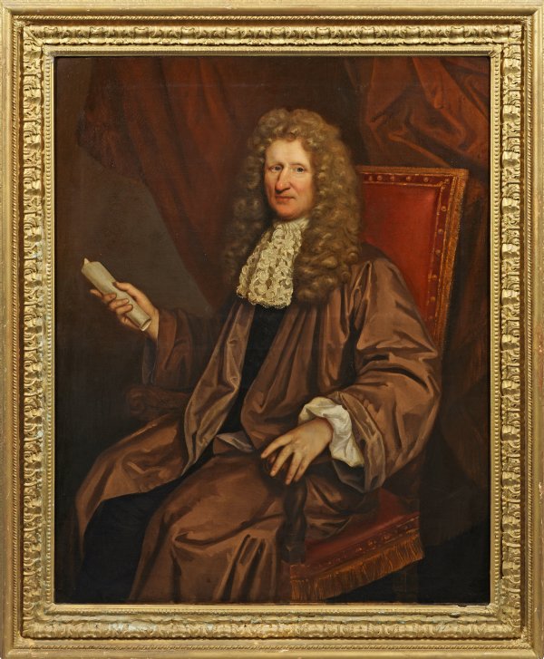 Überlebensgroßes, repräsentatives Bildnis eines sitzenden Herrn mittleren Alters mit Allongeperücke, langem, braunem Mantel und Spitzenjabot. Komposition und Stil des Bildnisses sind von der in Europa seinerzeit führenden französischen Porträtisten Hyacinthe Rigaud und Nicolas de Largillière beeinflusst. Huber hielt sich 1685-1693 in Italien auf, wo er in Venedig zahlreiche, nach dem Leben gemalte Bildnisse schuf, u. a. des Dogen Francesco Morosini und des sächsischen Kurfürsten August dem Starken; in Rom trat er um 1689 in die römische Kunstakademie ein und wurde Schüler von Carlo Maratta. 1693 kehrte er nach Basel zurück, wo er bis 1694 für Markgraf Friedrich VII. Magnus von Baden-Durlach 22 Bildnisse seiner Familie schuf (auch später war er über Jahrzehnte Porträtist der Markgrafen). 1696-1699 arbeitete Huber am Hof des Herzogs von Württemberg in Stuttgart, 1702-1738 größtenteils in Bern, wo er als versierter Porträtmaler gefragt war. Öl/Lwd., doubl.; Verso altes Sammlungs-Etikett mit Zuschreibung an Huber. 126,5 cm x 103 cm. Rahmen.