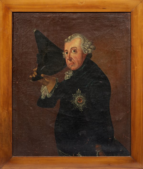 Repräsentatives Hüftbildnis Friedrich II. als "Alter Fritz" im Halbprofil in dunkelblauem Uniformrock mit dem Bruststern des Schwarzen Adlerordens, den Dreispitz zum Gruß ziehend. Die Darstellung geht auf ein berühmtes, einflussreiches, 1763/64 im Auftrag des Königs von J. H. C. Franke geschaffenes Gemälde zurück, das sich heute im Besitz der Stiftung Preußische Schlösser und Gärten befindet. Es gibt durch den Gestus des Grüßens mit abgesetztem Dreispitz dem Selbstverständnis Friedrichs II. als aufgeklärter Monarch beredten Ausdruck. Das Bildnis fand durch Wiederholungen durch Franke selbst und aus seiner Werkstatt sowie in zahlreichen Repliken und Kopien bis um 1780 weite Verbreitung. Öl/Lwd.; 77 cm x 63 cm. Biedermeier-Rahmen.