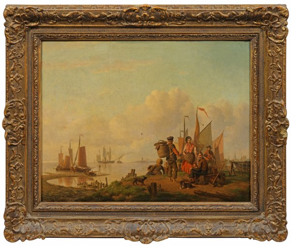 Spätromantische, atmosphärisch gestimmte, idyllisierende Szene mit einer Gruppe von Fischern, Fischersfrauen und Hunden vor einer ruhigen, sommerlich heiteren Bucht eines kleinen Hafenortes mit angelandeten Fischerbooten sowie einem Dreimaster im Hintergrund. Schelfhout prägte sowohl durch seine Gemälde (u. a. Strandszenen mit Fischern) selbst, als auch durch seine Schüler wie Charles Leickert und Wijnand Nuijen, die niederländische Landschaftsmalerei seiner Zeit. Öl/Lwd.; 46 cm x 60 cm. Rahmen.