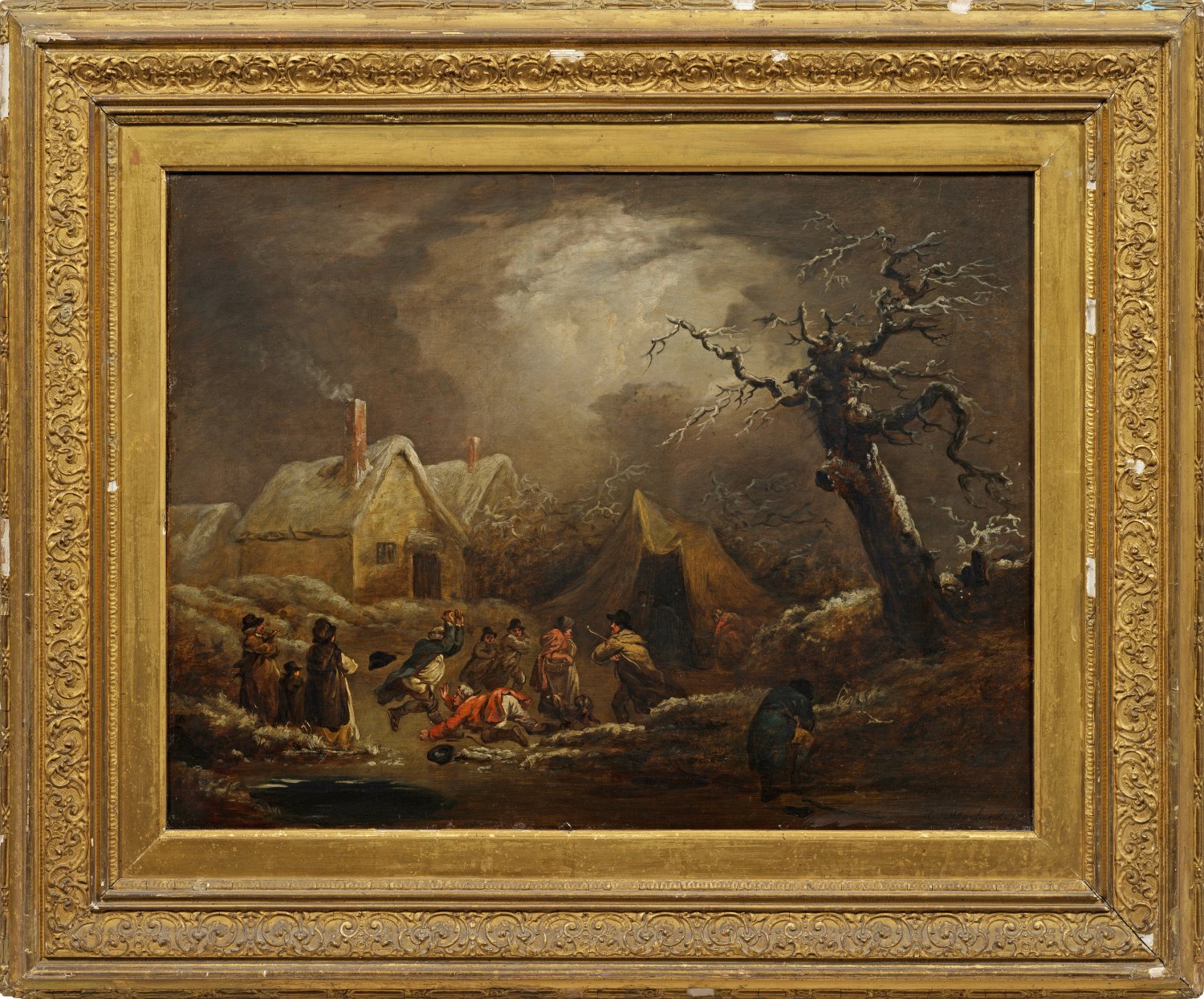Höchst lebendig und humorvoll geschilderte, erzählerische Szene Morlands, der hierin nicht mit einer gewissen Schadenfreude spart. Der überaus schaffensreiche Maler stammte aus einer Künstlerfamilie und wurde zunächst von Francis Wheatley beeinflusst, bis er in den 1790er Jahren seinen eigenen Stil entwickelte. Mit Vorliebe malte er ländliche Motive, Bauernhöfe und Jagd, Schmuggler, Zigeuner und Landschaften, inspiriert durch die niederländische und flämische Malerei des Goldenen Zeitalters. 1773 stellte Morland erstmals und 1784-1804 regelmäßig in der Royal Academy aus, 1788-1792 wurden über 100 Kupferstiche nach Morland veröffentlicht. Öl/Lwd., doubl.; R. u. sign.; 46 cm x 61 cm. Rahmen.