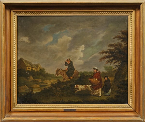 Lebendig und mit subtilem Humor geschilderte ländliche Szene Morlands, der des Öfteren Esel in seinen Gemälden darstellte. Der überaus schaffensreiche Maler stammte aus einer Künstlerfamilie und wurde zunächst von Francis Wheatley beeinflusst, bis er in den 1790er Jahren seinen eigenen Stil entwickelte. Mit Vorliebe malte er ländliche Szenen, Bauernhöfe und Jagd, Schmuggler, Zigeuner und Landschaften, inspiriert durch die niederländische und flämische Malerei des Goldenen Zeitalters. 1773 stellte Morland erstmals und 1784-1804 regelmäßig in der Royal Academy aus, 1788-1792 wurden über 100 Kupferstiche nach Morland veröffentlicht. Öl/Lwd.; R. u. neben dem Kopf des Mädchens bez.; 43 cm x 54 cm. Rahmen.