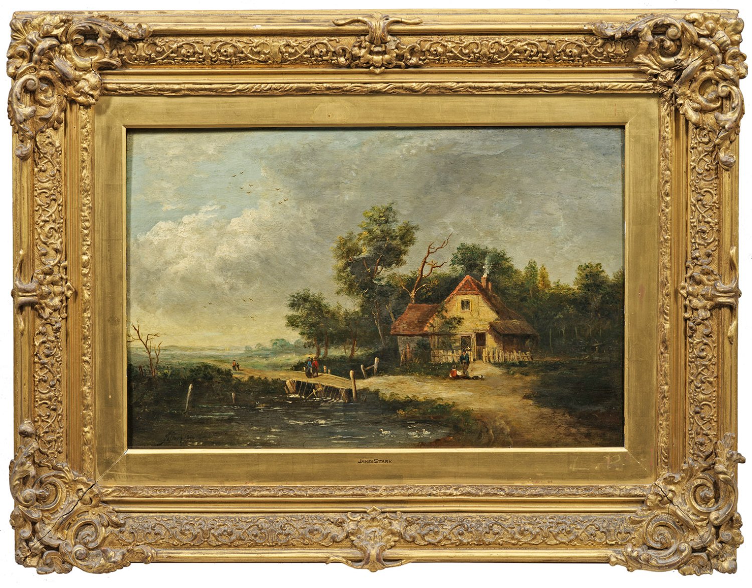 Romantisches Werk des englischen Landschaftsmalers, der ein führendes Mitglied der Norwich School of Painters war und 1829 zum Präsidenten der Norwich Society of Artists gewählt wurde. Stark lernte zunächst bei John Crome inNorwich, schon 1811 wurden seine Gemälde erstmals in London und 1814-1818 auch in der British Institution in London ausgestellt. 1817-1819 studierte Stark an der Royal Academy in London, danach kehrte er nach Norwich zurück, bevor er 1840-1849 in Windsor und schließlich seit 1849 wieder in London tätig war. Öl/Eichenholztafel. L. u. sign. u. dat. 1844. 46 cm x 72 cm. Rahmen.