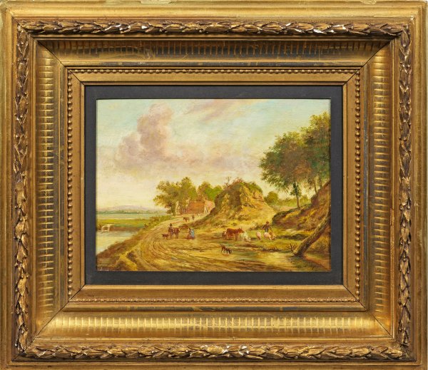 Atmosphärisch gestimmtes, fein gemaltes Kabinettbild. Lorenz entstammte aus der großen, weitverzweigten italienisch-deutschen Künstlerfamilie Quaglio, zu seinen Brüdern gehörten die Landschafts-, Architektur- und Genremaler Domenico, Angelo und Simon Quaglio. In seinem Oeuvre verband Lorenzo Darstellungen des Alltagslebens mit Landschaften und Interieurs, meist aus Oberbayern. Öl/Holztafel. R. u. sign. "L.(?) Quaglio. 18 cm x 25 cm. Rahmen.