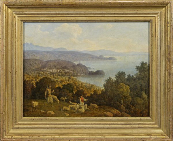Sehr fein gemalte, romantische Ideal-Landschaft. Der Betrachter schaut von einer Anhöhe mit Schafhirten in der Kleidung von Krim-Tataren und ihrer Herde über dicht bewaldete Hänge auf die Bucht von Partenit(e). Der bedeutende Landschaftsmaler Karl von Kügelgen und sein Zwillingsbruder, der Porträt- und Historienmaler Gerhard von Kügeln (1772 - 1820), waren Söhne des kurkölnischen Hofkammerrats Franz Anton Kügelgen (1727 - 1788), konnten sich jedoch erst nach dem Tod des Vaters der von ihm zuvor verbotenen Kunstleidenschaft zuwenden. Seit 1791 hielt sich Karl von Kügelgen mit einem kurfürstlichen Stipendium in Rom auf, doch musste er 1796 wegen der Napoleonischen Kriege über Wien nach Berlin gehen. 1798 folgte Karl von Kügelgen seinem Bruder nach St. Petersburg, wo ihn Zar Paul I. (1754 - 1801) zum hochdotierten Hofmaler berief. 1804 wurde Karl von Kügelgen zum ordentlichen Mitglied der Berliner Akademie der Künste ernannt, nachdem ihn kurz zuvor auch die St. Petersburger Akademie aufgenommen hatte. In den Jahren 1804 und 1806 bereiste Karl von Kügelgen im Auftrag des neuen Zaren Alexander I. (1777 - 1825) die Halbinsel Krim. Während dieser Reisen fertigte Kügelgen circa 400 (nach anderen Schätzungen 200) Skizzen an, nach denen er dann später fast gleich viele, bildmäßige, sorgfältig ausgeführte Sepia-Bilder schuf, wovon sich 40 Blätter in der Eremitage in St. Petersburg erhalten haben. Diese vom Künstler eigenhändig montierten und bezeichneten, leicht und luftig wirkenden Bilder, sollten dem Zaren einen Eindruck von der dortigen malerischen, südlichen Landschaft geben. Überdies führte Kügelgen nach den Krim-Sepien 30 Landschaftsbilder für einen der Sommerpaläste Alexanders aus. Zu den Sepiabildern der Krim gehörte auch die Ansicht "Partenite", welche die Vorlage des vorliegenden Bildes ist und durch die Staffage im Vordergrund ergänzt wurde. Karl von Kügelgen widmete sich außer der Malerei auch der noch relativ neuen Lithographie und schaffte auf diesem Gebiet seit 1819 beachtliche Arbeiten. 1827 veröffentlichte er 16 der Krim-Zeichnungen unter dem Titel "Vues pittoresques de la Crimei". Darunter befand sich auch das vorliegende Blatt mit dem Blick auf Partenit(e), "das Kügelgeln so übermalte, das der grafische Bildgrund nicht zu erkennen ist. Nach der Veröffentlichung der Krim-Lithographien würde ich das Bild 'um 1827' datieren. Ein weiteres Bild von Kügelgen in dieser Technik ist bisher nicht bekannt" (Zit. Dr. Dorothee von Hellermann in ihrem Gutachten). Öl über Lithographie/Papier, auf Hartfaser kaschiert. R. u. sign. "C de Kügelgen". 29 cm x 38 cm. Rahmen.