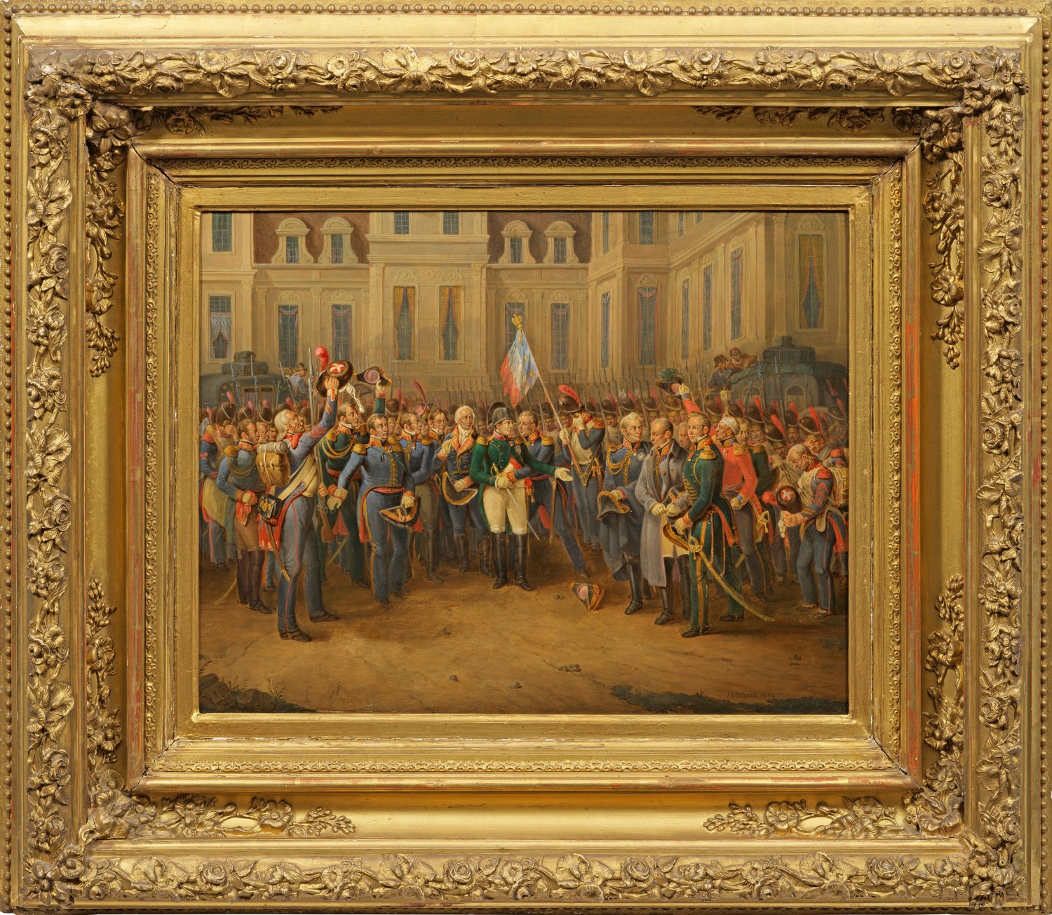 Der heute vor allem als Genremaler bekannte schwäbische Künstler hat sich in einer Reihe von circa 50 Werken überdies intensiv mit Militär-, Schlachten- und Historienbildern befasst - der folgenreichen, nur wenig zurückliegenden napoleonischen Epoche mit den Koalitionskriegen und den Napoleonischen Kriegen von 1792 bis 1815. Meist hat Pflug hierbei französische Niederlagen dargestellt, mehrfach schilderte er Napoleon als Feldherrn vor der von ihm verlorenen Schlacht von Aspern (1809), die dessen Unbesiegbarkeit in Frage stellte. In diesem Zusammenhang steht auch das vorliegende, in fein lasierender Malweise ausgeführte Gemälde, das in seiner Komposition, dem Kolorit und in der Vielfigurigkeit ein charakteristisches, repräsentatives Beispiel für die militärischen Bilder Pflugs ist. Zugleich ist es sicherlich auch als persönlicher Ausdruck Pflugs und der weitverbreiteten antifranzösischen Haltung seiner Zeit zu interpretieren, da Napoleon hier an einem Tiefpunkt dargestellt ist: als Napoleon nach seinem Sturz abdanken musste und bevor er in die Verbannung nach Elba geschickt wurde, gab er am 20. April 1814 seinen Abschied von der "Vieille Garde" im Hof des Schlosses Fontainebleau bekannt und hielt eine Rede an die kaiserliche Garde, die ihm treu gebliebenen Offiziere, Unteroffiziere und Soldaten. Im Aufbau hat sich Pflug an dem berühmten Gemälde des französischen Militär- und Historienmalers Horace Vernet (1789-1863) orientiert, das heute nur noch in einer Kopie aus dem Jahr 1825 im Schloss Versailles überliefert ist. In zwei wesentlichen Details hat Pflug die Komposition Vernets jedoch in freier Form abgewandelt: am rechten Bildrand stellte sich Pflug selbst als Trommler in nachdenklich sinnierender Pose dar; auf der linken Bildseite steht ein hochgewachsener, älterer Soldat, der in der hochgestreckten Hand eine Bärenfellmütze zum Abschiedsgruß hält. Beide tragen französische Grenadier-Uniformen der alten kaiserlichen Garde und die zugehörigen goldenen Ohrringe, doch hat er deren Bärenfellmützen auf der Oberseite durch ein weißes Kreuz auf rotem Grund modifiziert, dessen Deutung bisher nicht eindeutig geklärt werden konnte. Pflug erhielt seine künstlerische Ausbildung 1806-1809 an der Münchener Akademie, 1810 erhielt eine Stelle als Zeichenlehrer in Biberach und unterrichtete während der folgenden 45 Jahre seiner Dienstzeit zahlreiche später erfolgreiche Maler wie Anton Braith. Öl/Eichenholztafel. R. u. sign. u. dat. 1842. Verso alte, wohl eigenhändige Bez. "Pflug aus Biberach (...)". 41,5 cm x 57 cm. Rahmen.