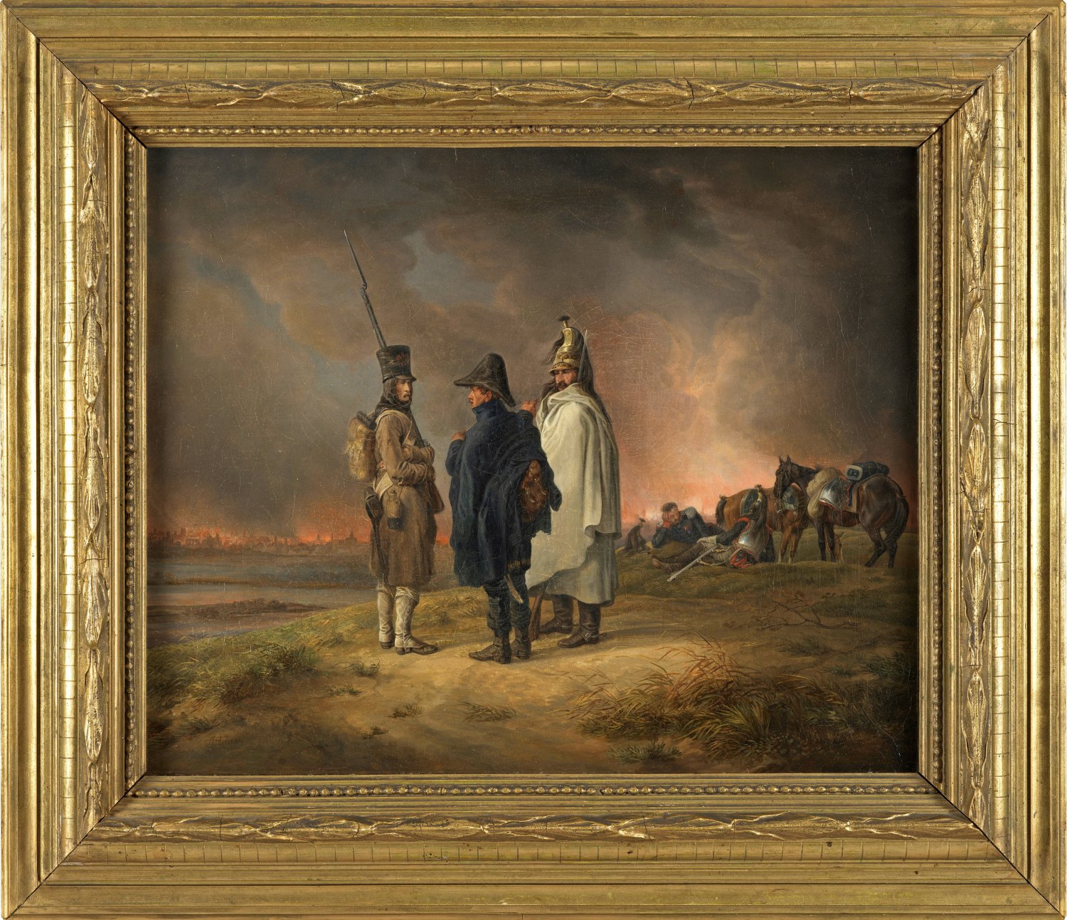 Auf einer sanften Anhöhe über dem Tal der Moskwa sind drei französische Militärs - ein Infanterist, ein Offizier und ein Kürassier (oder Dragoner) im weißen Reitermantel - in ein Gespräch vertieft, während sich rechts dahinter zwei Kürassiere neben ihren voll bepackten und gesattelten Pferden erschöpft im Gras ausruhen. Im Hintergrund leuchtet die Stadtsilhouette von Moskau im glühenden Rot der lodernden Flammen auf und der rußgeschwärzte Himmel unterstreicht effektvoll das Ausmaß des wütenden Infernos. Fein lasierend und subtil nuanciert gemalte, imposante Schilderung des großen Brands von Moskau in der Nacht des 14. September 1812, welchen der Künstler hautnah vor Ort miterlebte. Als Schüler des Schlachtenmalers Johann Lorenz Rugendas d.J., hegte er schon früh den Wunsch, Kriegsgeschehen aus erster Hand zu erleben und wohnte daher bereits 1809 den Schlachten von Aspern und Wagram bei. 1812 nahm er schließlich von Mai bis Dezember im Gefolge von Napoleons Grande Armée und als Reisebegleiter von Eugène de Beauharnais, dem Vizekönig von Italien, am großen Russlandfeldzug teil. Die Eindrücke, die er hierbei auf den Schlachtfeldern von u. a. Moshaisk, Borodino, Semlewo, Smolensk und Moskau sammelte, verarbeitete er anschließend in einer lithografischen Serie von 100 Blättern, die er in Zusammenarbeit mit seinen Söhnen Benno und Franz Adam unter dem Titel "Voyage pittoresque et militaire de Willenberg en Prusse jusqu‘à Moscou 1812" in den Jahren 1827 bis 1833 fertigte. Einzelnen Protagonisten dieser Arbeiten begegnet man auch in dem vorliegenden Gemälde: "Ein französischer Wachposten" (Tafel 49) ist in der Darstellung des links außen stehenden Infanteristen mit Gewehr und Bajonett rezipiert, während der rechts stehende Soldat in weißem Mantel dem Motiv "Auf dem Schlachtfeld bei Moskau am 8. September" entlehnt ist. Öl/Lwd., doubliert. L. u. sign. und dat. 1829. 43,5 cm x 54,5 cm. Rahmen.