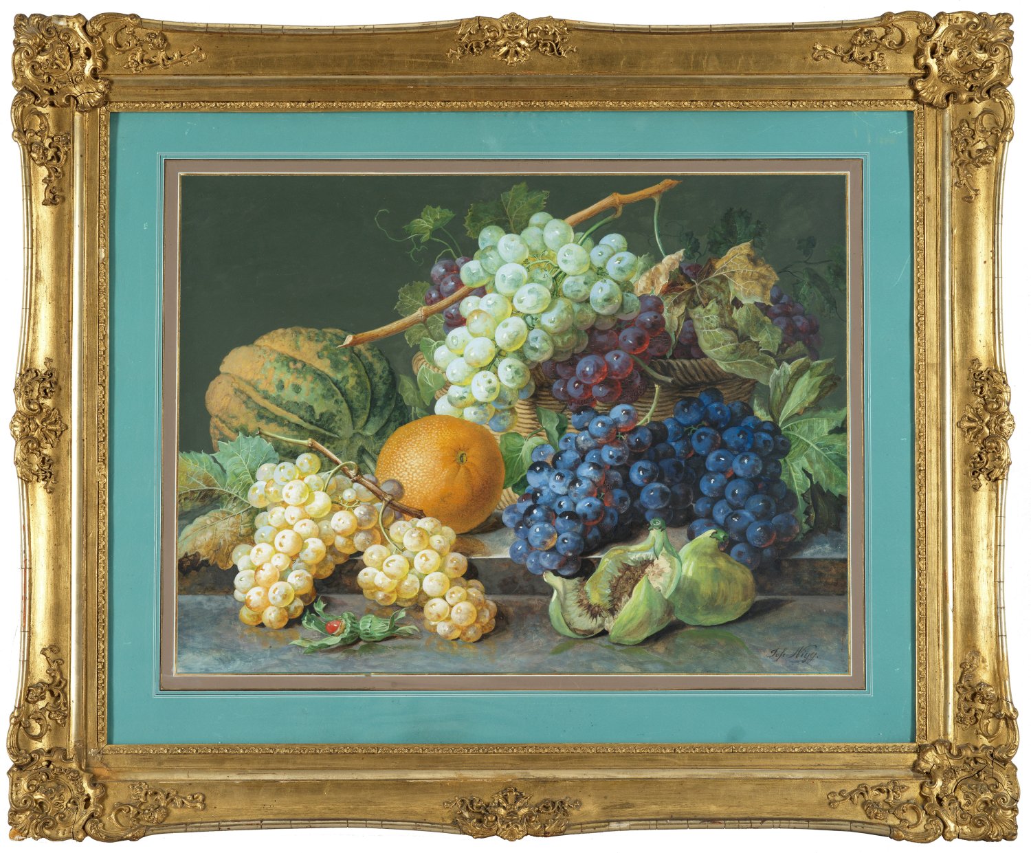 Auf einem steinernen, gestuften Untergrund vor neutralem Hintergrund komponiertes, üppiges Arrangement aus einem Weidekorb mit äußerst naturgetreu wiedergegebenen Weintrauben und -reben, Feigen, Haselnüssen sowie einem Kürbis und einer Apfelsine. Das großformatige Blatt ist ein stiltypisches Werk Niggs, der als einer der besten österreichischen Stilllebenmaler in der 1. Hälfte des 19. Jhs. gilt. Der Künstler studierte an der Akademie bei Johann Baptist Drechsler und spezialisierte sich auf Blumenstücke. Er führte seine meisterhaften Stillleben sowohl in Öl-, Pastell- und Gouachemalerei als auch auf großformatigen Porzellanplatten der Wiener Porzellanmanufaktur aus, welche er seit 1824 in vielen Ausstellungen zeigte. Öl- und Porzellangemälde Niggs befinden sich u.a. im Lichtenstein-Museum, im Belvedere und im Wien-Museum. Gouache/Papier. R. u. sign.; 42,1 cm x 56,6 cm. Rahmen.