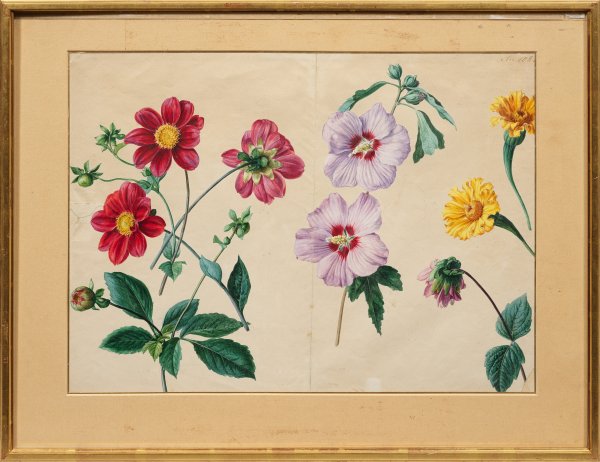 Botanisch getreue Darstellungen. Petter, der seit 1816 vielfach ausstellte, war einer der bedeutendsten Blumenstilllebenmaler der Biedermeier-Zeit in Wien. Er studierte an der Wiener Akademie bei Johann Baptist Drechsler und dessen Nachfolger an der Manufakturzeichenschule Sebastian Wegmayr; 1815 wurde er Korrektor an der Blumenzeichenschule der Akademie, 1822 Professor an der Manufakturzeichenschule, 1835 Direktor. Aquarell, Gouache u. Bleistift/Papier. R. o. bez. "Nro 108". Mittelfalz, äußerste rechte untere Ecke rest., am linken Rand ein rest. Einriss. 34 cm x 47 cm (Passepartoutausschnitt). Rahmen (besch.).