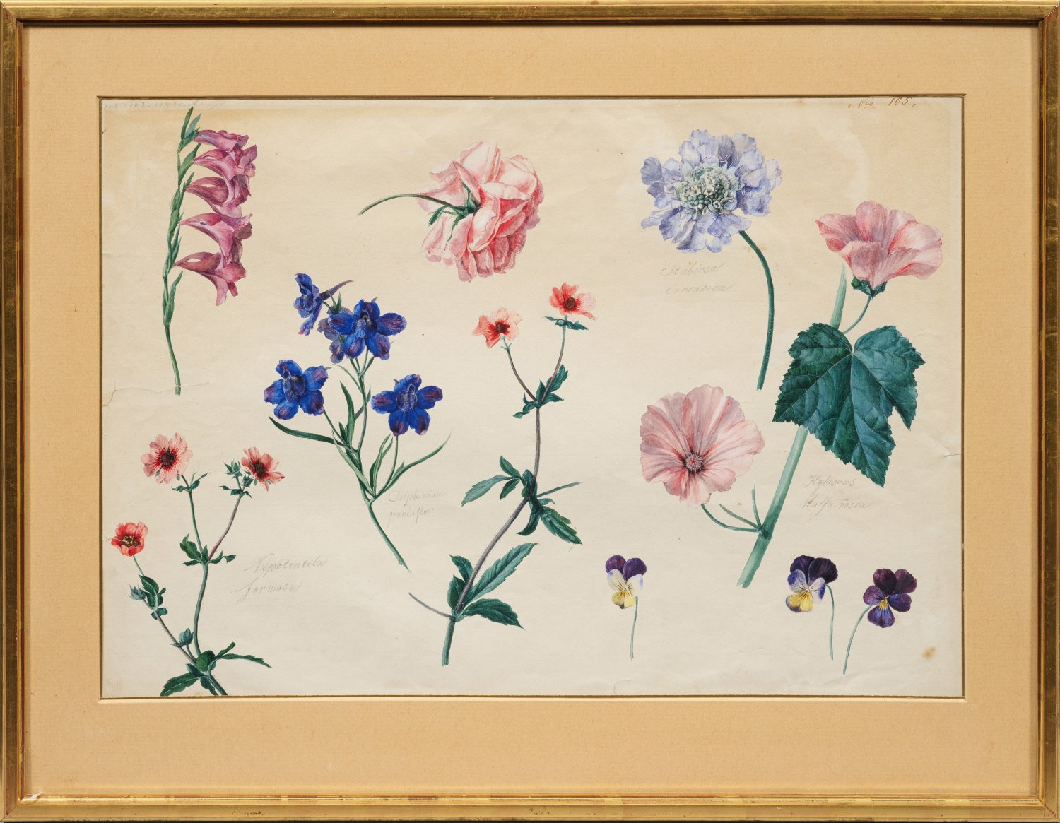 Botanisch getreue Darstellungen, teilw. lateinisch bez.; Petter, der seit 1816 zunächst auf Kunstausstellungen der Akademie, dann im Österreichischen Kunstverein regelmäßig ausstellte, war einer der bedeutendsten Blumenstilllebenmaler der Biedermeier-Zeit in Wien. Er studierte an der Wiener Akademie bei Johann Baptist Drechsler und dessen Nachfolger an der Manufakturzeichenschule Sebastian Wegmayr. 1815 wurde er Korrektor an der Blumenzeichenschule der Akademie, 1822 Professor an der Manufakturzeichenschule, 1835 Direktor. Aquarell, Gouache u. Bleistift/Papier. R. o. bez. "Nro 105". Minim. Randeinrisse, leicht gebräunt. 34 cm x 49 cm (Passepartoutausschnitt). Rahmen.