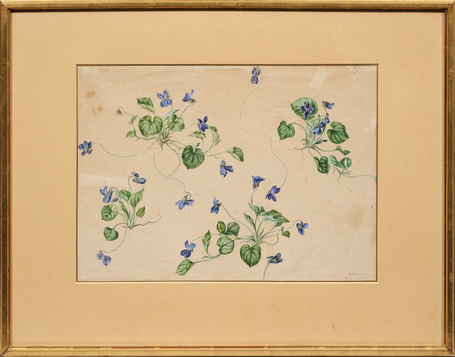 Botanisch getreue Darstellungen. Petter, der seit 1816 zunächst die Ausstellungen der Akademie, später des Österreichischen Kunstvereins regelmäßig beschickte, war einer der bedeutendsten Blumenstilllebenmaler der Biedermeier-Zeit in Wien. Er studierte an der Wiener Akademie bei Johann Baptist Drechsler und dessen Nachfolger an der Manufakturzeichenschule Sebastian Wegmayr. 1815 wurde er Korrektor an der Blumenzeichenschule der Akademie, 1822 Professor an der Manufakturzeichenschule, 1835 Direktor. Aquarell, Gouache u. Bleistift/Papier. R. u. Nachlass-Stempel; r. o. bez. "Nro 97". Mehrere Randeinrisse, l. o. wenige Stockflecken. 28 cm x 40 cm (Passepartoutausschnitt). Rahmen.