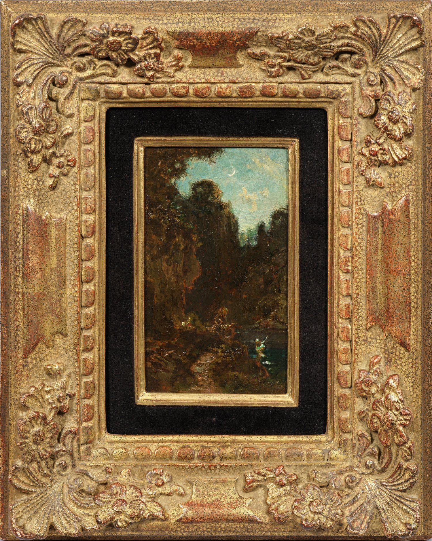 Szenische Darstellung im Mondschein. Vor seiner Klause an einem Waldsee in einer Felsenschlucht sitzender, in einem Buch lesender alter Einsiedler-Mönch. Auf der rechten Bildseite steigt eine unbekleidete Nixe als personifizierte Versuchung aus dem Wasser auf, deren Körper hell im Mondlicht erscheint. Links neben dem Einsiedler einige auf einem Tisch abgestellte Gefäße, ebenfalls vom Mond angestrahlt. Um 1865 entstandenes Kabinettbild als Studie für eine bisher schon bekannte, andere, größere Version, die Spitzweg selbst im eigenen Verkaufsverzeichnis (unter Nr. 423) kurz beschrieben hat: "Tentation (eines Einsiedlers durch eine Nixe" (Wichmann, Wvz.-Nr. 666, siehe Lit.). Spitzweg hat sich in seinem Oeuvre nicht nur vielfach mit Mönchen und Einsiedlern befasst, sondern in einem über 20 Gemälde umfassenden Werkkomplex seit circa 1840, vor allem im Zeitraum um 1860 bis 1870 mit dem Thema badender Nymphen und Nixen (Wichmann, Nr. 650-673). Bei dem vorliegenden Gemälde konnte Spitzweg, inspiriert durch alte Darstellungen der Versuchung des Hl. Antonius, naheliegend beide Motive miteinander kombinieren und zugleich meisterhaft höchst effektvolle Beleuchtungsmotive schildern. Spitzweg widmete sich ab 1835 ausschließlich der Malerei, wurde Mitglied des Münchener Kunstvereins und stellte ab 1839 vielfach erfolgreich aus. Kaiserin Elisabeth v. Österreich und Prinzregent Luitpold gehörten zu seinen Sammlern. Anfangs noch dem Biedermeier verbunden, schilderte er zunächst das Leben des biedermeierlichen Bürgertums und kauzige Sonderlinge. In seinen späteren Werken wurde das landschaftliche immer wichtiger beeinflusst, insbesondere durch den eng befreundeten Eduard Schleich d. Ä., der als bedeutender Wegbereiter der Freilichtmalerei in Deutschland gilt. Mit ihm unternahm Spitzweg zahlreiche Reisen, u. a. 1851 nach Paris, wo die Schule von Barbizon großen Eindruck auf die beiden Künstler machte. Auch in diesem Gemälde Spitzwegs ist eine freiere, flächigere Malweise evident, bei der es Spitzweg nicht mehr um die realistische Wiedergabe von Details, sondern um die Gesamtstimmung ging, die hier durch das Licht gesteigert wird. Öl/Holztafel. Verso zwei alte Etiketten mit handschriftlicher Bez. "L 65 Spitzweg" sowie "(...) Mondlandschaft (...)". 18 cm x 11 cm.