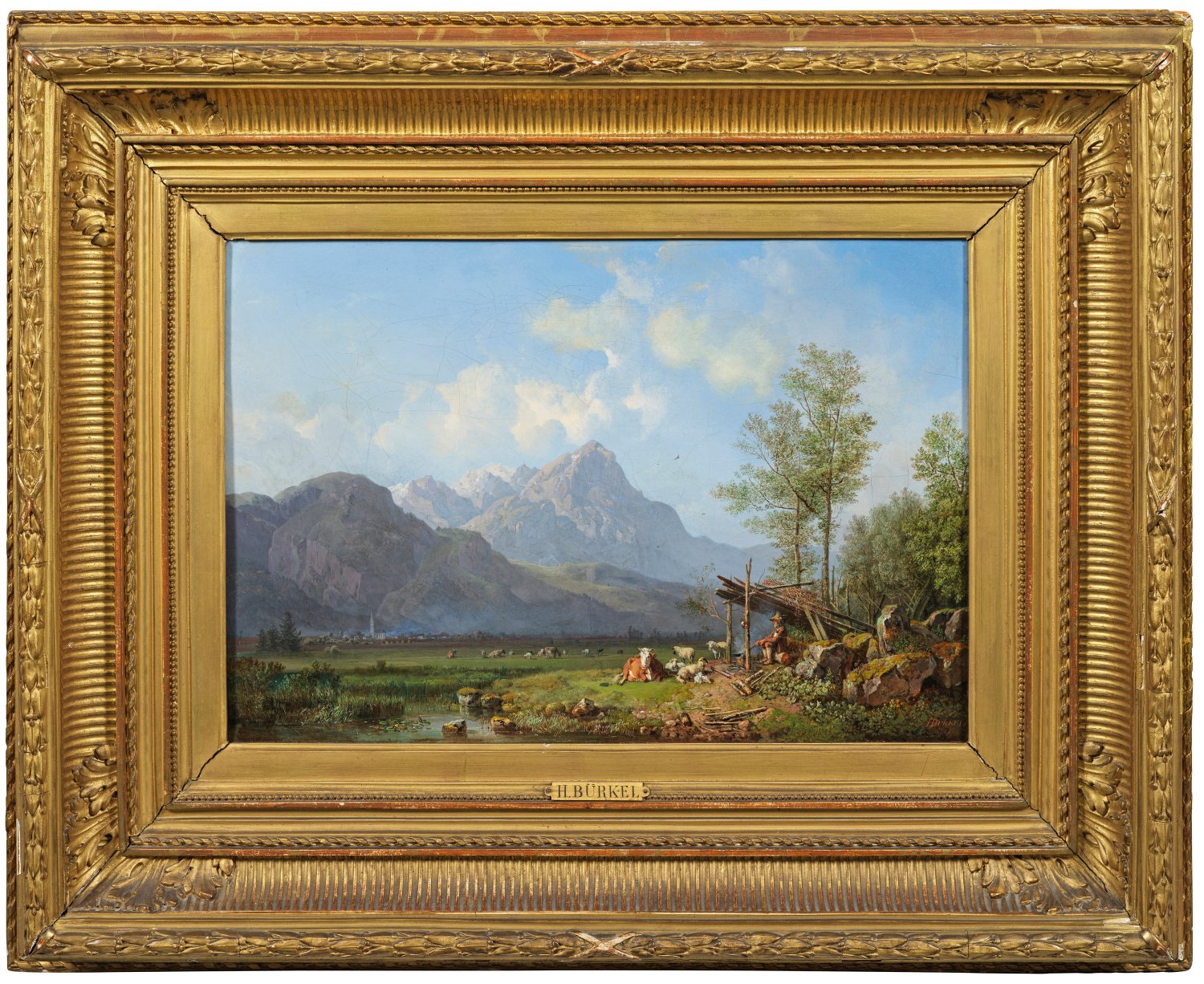 Feinmalerisch ausgeführte, detailreiche, atmosphärisch gestimmte, sommerlich heitere Landschaft, wohl um 1845-1850. Im Vordergrund auf der rechten Bildseite ein alter Hirte, der unter einem einfachen Unterstand mit Bretterdach sitzt und sich mittels einer langen Stielpfanne Essen am Lagerfeuer zubereitet; im Hintergrund ein Kirchdorf unterhalb eines hoch aufragenden Bergmassivs. Für Bürkel charakteristische, motiv- und stiltypische Darstellung des Landlebens, die sich durch liebevolle Darstellung der topographischen Details sowie der Figuren und Tiere im warmen Licht der Sonne auszeichnet. Bürkel, der sich vor allem in der Gattung der sog. Genrelandschaft einen Namen machte, wurde 1824 Gründungsmitglied des Münchener Kunstvereins. Hauptsujet Bürkels waren bäuerliche Szenen aus dem Volksleben, die er in ländliche Umgebungen Oberbayerns und Italiens einbettete. Insgesamt viermal (1827, 1830, 1837 und 1853) reiste er nach Italien (u. a. Rom, Tivoli, Campagna und Venedig) und blieb teilweise bis zu zwei Jahre dort; andere Studienreisen führten ihn nach Tirol (darunter Rattenberg), in die Umgebung von München, durch die Bayerischen Voralpen und Oberbayern: an den Tegernsee und Starnberger See, zur Benediktenwand bei Benediktbeuern, in das Inntal, nach Garmisch-Partenkirchen, Ramsau bei Berchtesgaden, zur Zugspitze etc.; Ausstellungen in München, Dresden und Berlin sowie die Weltausstellungen in London 1862 und Paris 1867 machten ihn weithin bekannt und international begehrt. Öl/Lwd., doubl.; R. u. sign. ("H" und "B" ligiert). 34 cm x 51,5 cm. Rahmen.