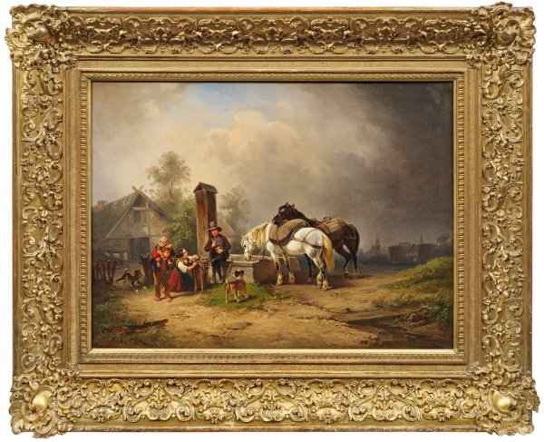 Erzählerisches, stimmungsvolles Genrebild mit dem an der Tränke sitzenden Mann, der sich Brot abschneidet, während eine junge, neugierig kniende Bäuerin, zwei Kinder und Hunde herbeigeeilt sind; im Hintergrund Blick auf ein Kirchdorf. Wilhelm Alexander Meyerheim stammte aus einer alten Danziger Künstlerfamilie und studierte zusammen mit seinem älteren Bruder Friedrich Eduard Meyerheim an der Berliner Akademie bei Johann Gottfried Niedlich und Johann Gottfried Schadlos und bildete sich in Düsseldorf weiter. Ab 1842 beschickte Meyerheim vielfach die Berliner Akademie-Ausstellungen. Mit Vorliebe malte er in spätbiedermeierlicher Weise Motive aus dem Volksleben, Stadtansichten und Landschaftsmotive an Flüssen, die er häufig mit Pferden, Reitern, Kutschern, Bauern und Soldaten belebte. Öl/Lwd.; L. u. sign. u. undeutl. dat. 1870(?). 52 cm x 70 cm. Original-Rahmen.