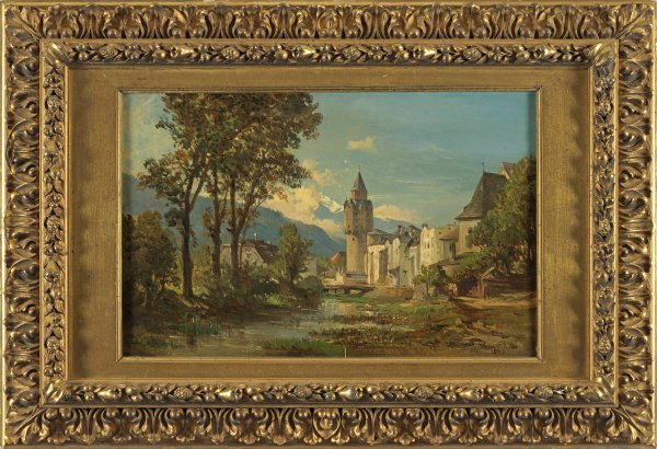 Sommerlich gestimmte, reizvolle Ansicht der Burg Hasegg in der Stadt Hall in Tirol mit einem idyllischen Bachlauf vor Alpenkulisse. In heiterem, fein nuanciertem Kolorit gemalte, charakteristische Ansicht des Architektur- und Landschaftsmalers Kirchner, der an der Akademie in Leipzig bei Friedrich Brauers und an der Akademie in Dresden bei Johan Christian Clausen Dahl und Caspar David Friedrich ausgebildet wurde. Neben der Malerei fertigte er auch zahlreiche Zeichnungen und Illustrationen als Auftragsarbeiten und fand seine Motive nicht zuletzt auf seinen zahlreichen Reisen nach Italien, in die Rheingegend und nach Heidelberg. Öl/Papier, kaschiert auf Lwd.; R. u. sign. mit Ortsangabe Hall und dat. 27. Sept(...) 1860. Ca. 33 cm x 51 cm. Rahmen.