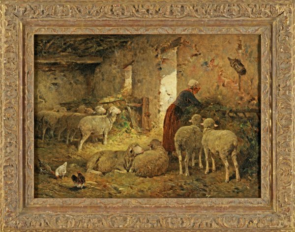 Bedächtig befüllt eine Magd die Futterkrippe mit frischem Heu und wird dabei erwartungsvoll von den Schafen um sie herum beobachtet. Im Vordergrund picken zwei Hühner Körner, daneben liegen zwei Schafe eng aneinander geschmiegt auf dem Stroh. Durch eine effektvolle Lichtführung stimmungsvoll inszenierte, einfühlsam geschilderte und somit repräsentative Stallszene Brissots, der an der École des Beaux-Arts studierte und von Léon Coignet ausgebildet wurde. Ab 1840 stellte er im Pariser Salon aus, wo er besonders für seine subtil beobachteten Schafherden und Schäferszenen gerühmt wurde. Öl/Lwd., doubliert. L. u. sign.; Verso Galerie-Etikett. 43,5 cm x 61,5 cm. Rahmen.