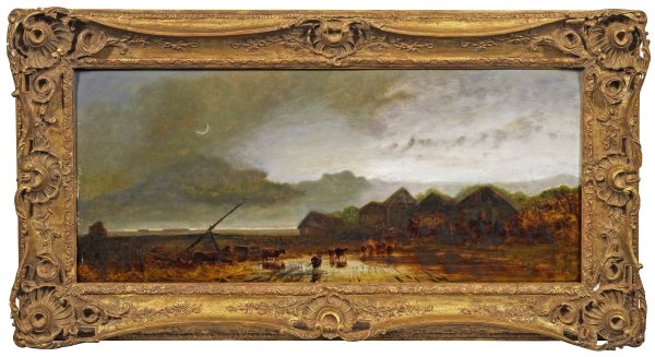 Tonig gemalte, im breiten Querformat komponierte Landschaftsimpression mit Halbmond am Himmel. Schleich zeigt sich in diesem Gemälde als Meister in der Wiedergabe effektvoller Lichtstimmungen. 1823 kam er nach München, wo ihn Christian Morgenstern und Carl Rottmann beeinflussten. Er war bestrebt, den Gesamteindruck der Naturszenerie wiederzugeben, das wechselnde Spiel der atmosphärischen Vorgänge und des Lichts. Hierbei widmete er sich zunächst den Alpen als Hauptsujet. 1851 unternahm er zusammen mit Spitzweg eine Studienreise nach Paris, wo ihn die Gemälde der Schule von Barbizon zu einer freieren und pastosen Behandlung der Farbe inspirierten. Schleich gilt als einer der Vorreiter der Dachauer Künstlerkolonie, wohin es ihn seit den frühen 1840er Jahren immer wieder zog. Öl/Holztafel, alt bzw. original parkettiert. R. u. sign.; 37 cm x 88 cm. Rahmen.