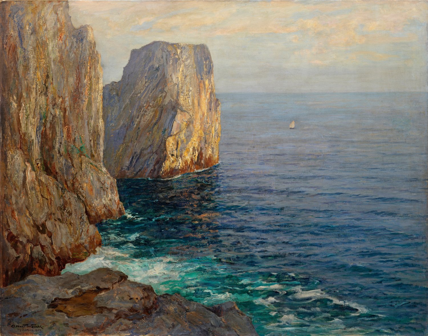 Großformatige, impressionistische Landschaft Wenks, der mit Vorliebe Capri-Motive malte. Stark beeinflusste ihn Gustav Schönleber, bei dem er an der Kunstschule in Karlsruhe studiert hatte. Bereits 1892/93 war er auf der Berliner Akademie-Ausstellung und Großen Berliner Kunstausstellung vertreten. Danach ließ er sich in München nieder, beschickte seitdem die Glaspalastausstellungen. 1911 erwarb Kaiserin Auguste Viktoria Wenks Gemälde "Abendfrieden auf Capri", viele Adelige und Industrielle kauften seine Kunstwerke, die bis nach Übersee gingen. Mehrfach war Wenk auf Kunstausstellungen in Pittsburgh vertreten, 1915 auch auf der "Panama-Pacific International Exposition" (Weltausstellung) in San Francisco. Öl/Lwd.; L. u. sign. mit Ortsangabe München 1908. 120 cm x 153 cm.