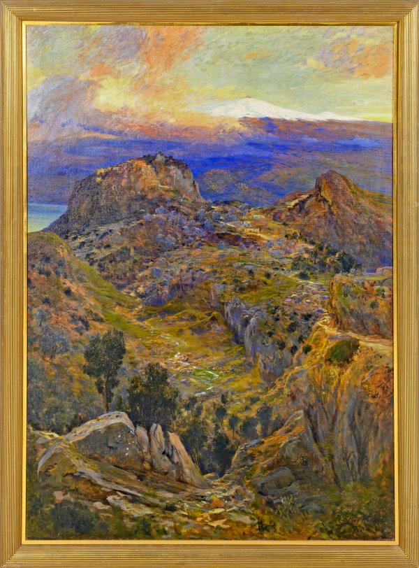 Großformatige, in hellem, leuchtendem Kolorit gemalte, impressionistische Landschaft, in der Roeder das südliche Licht einfing. Roeder lebte und arbeitete seit 1888 dauerhaft in Rom, nachdem er zuvor ab 1886 Italien bereist hatte. Von dort beschickte er auch 1895 und 1901 die Große Berliner Kunstausstellung mit symbolistischen Landschaften, sein Gemälde "Heiliger Hain" wurde 1908 für die Nationalgalerie erworben. Anfang des 20. Jhs. hatte sich Roeder durch seine Malerei, die vor allem in Italien mit dem Schaffen von Arnold Böcklin in Verbindung gebracht wurde, einen hervorragenden Ruf erarbeitet. 1910 war er erstmals auf der Biennale von Venedig vertreten. 1913 wurde er als Nachfolger von Othmar Brioschi zum Mitglied und Professore der Accademia di San Luca gewählt. König Viktor Emanuel III. zeichnete ihn durch Ankauf von Werken aus. Während des Ersten Weltkriegs war er vorübergehend wieder in Deutschland, nach dem Krieg gehörte Roeder jedoch erneut zu den anerkannten, aktiven Künstler in der römischen Kunstszene. Seine impressionistisch geprägten, poetisch aufgefassten, meist großformatigen Landschaften unterlegte er oft mit romantischen und symbolistischen Stimmungen, bevorzugt malte er Veduten von Villen Roms und Motive aus den Albaner Bergen. Öl/Lwd., doubl.; R. u. sign. u. dat. (19)14 mit Ortsangabe Rom. 151 cm x 110,5 cm. Rahmen.
