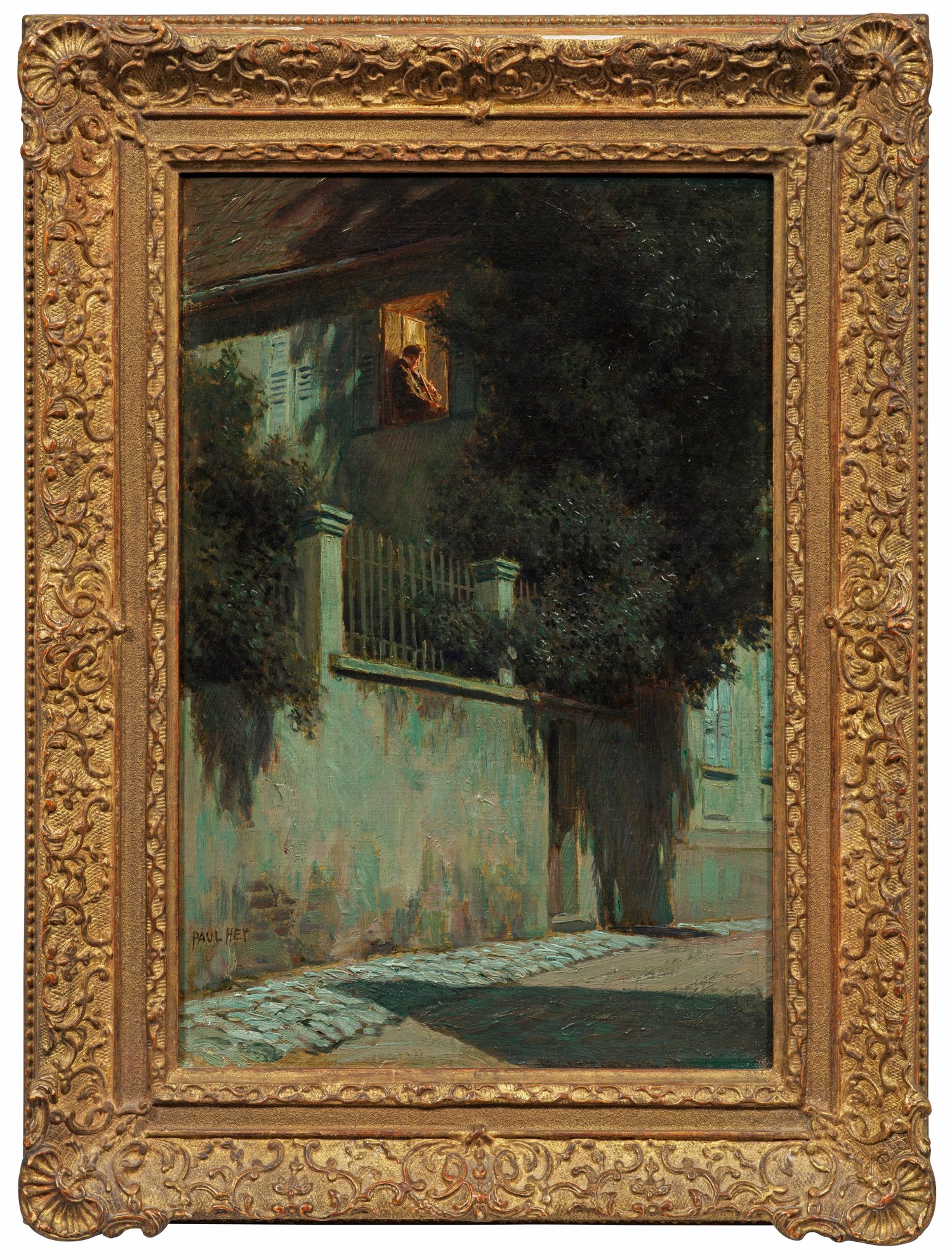 Impressionistisch aufgefasste Jugendstil-Darstellung mit Blick auf ein vom Mondlicht beschienenes Haus, in dem ein junger Mann am offenen, hell erleuchteten Fenster Violine spielt. Das Gemälde erschien auch als Künstler-Karte im F. A. Kunstverlag in München in der Postkartenreihe von Paul Hey "Aus der Kleinstadt". Ausgebildet an der Münchener Akademie bei Karl Raupp, Caspar Herterich, Ludwig von Löfftz und Heinrich von Zügel, schuf der Maler, Zeichner und Grafiker wie viele andere Künstler seiner Zeit höchst erfolgreich zahlreiche Illustrationen und Vorlagen für Illustrationen (u.a. Märchen) und Postkarten. Auf Ausstellungen war er seit 1894 mit Werken u. a. in der Großen Berliner Kunstausstellung und im Münchener Glaspalast vertreten. Öl/Lwd.; L. u. sign.; 36,5 cm x 25 cm. Rahmen.