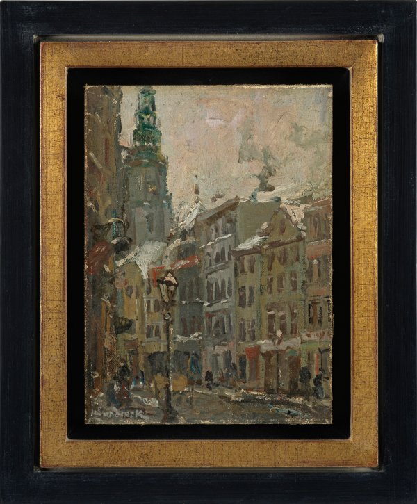 Impressionistische, mit schnellem Duktus und weich-pastosem Farbauftrag um 1912 gemalte, winterliche Ansicht der schlesischen Stadt Schweidnitz (Lohbergergraben/Langstraße), die in der Biographie des Künstlers früh eine Rolle spielt, da er dort sein Abitur ablegte. Sandrock lernte in Berlin bei dem Landschafts- und Marinemaler Herrmann Eschke und wurde Mitglied des Vereins Berliner Künstler. Ab 1897 beschickte er die Großen Berliner Kunstausstellungen. Öl/Lwd., kaschiert auf Platte. L. u. sign.; Verso bez. "Leonhard Sandrock (/) Friedenau b(ei)/Berlin Stubenrauchstr. 58 (/) 'Schweidnitz' 28". Wvz. NG 127. 20 cm x 14,5 cm. Rahmen.