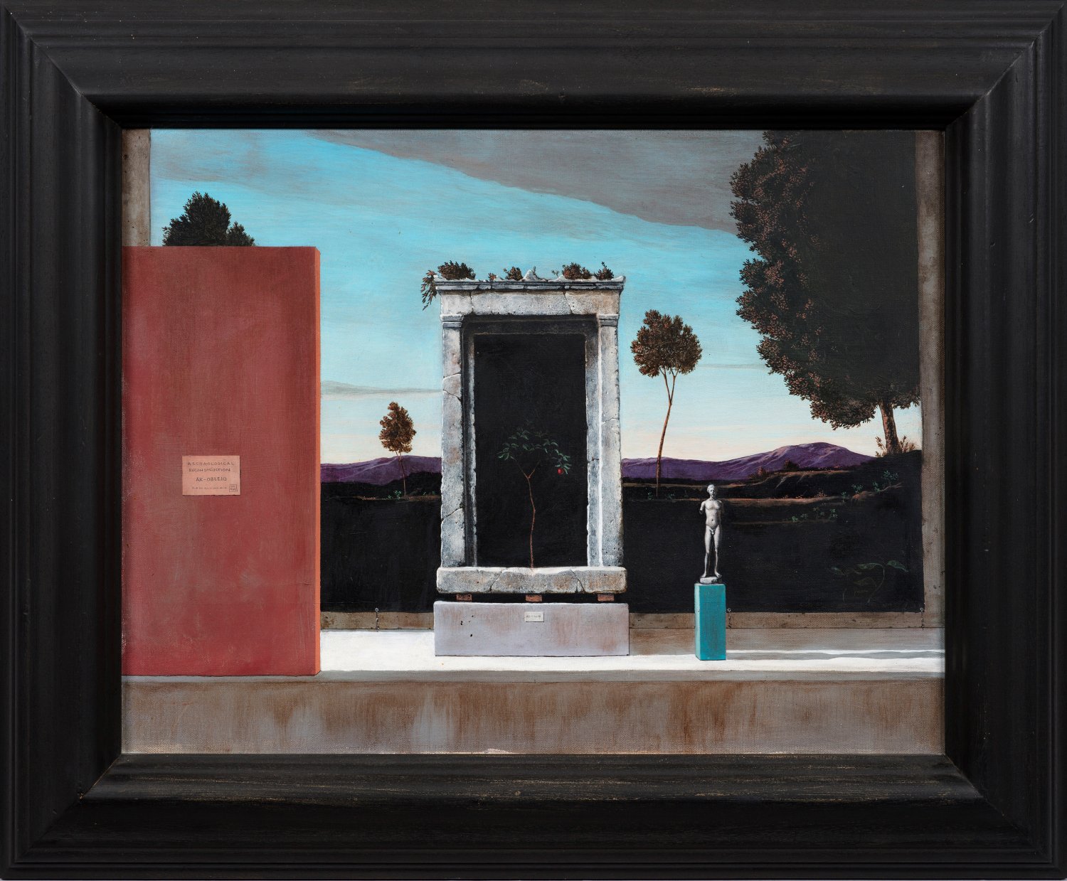 Surrealistische Darstellung vor weiter Landschaft, im Vordergrund ein antikes Steinmonument mit gemaltem Baum, flankiert von antiker Statue und moderner Wand. Von René Magritte und Giorgio de Chirico inspirierte Arbeit Mihaylovichs, der sich intensiv mit der Antike auseinandersetzt, in seine Werke ägyptische und griechisch-römisch anmutende Skulpturen komponiert sowie ideale Landschaften im Stil alter Meister malt. Öl/Lwd.; Links an der Wand betitelt, monogr. u. römisch dat. "MMI" (2001). 46 cm x 61,5 cm. Rahmen.