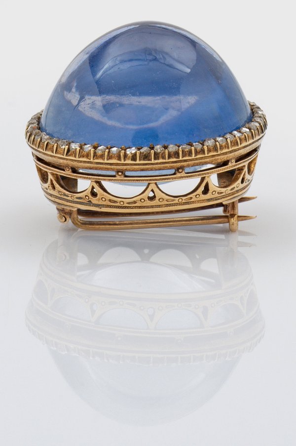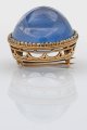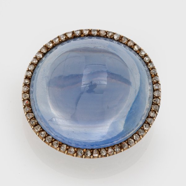 Roségold, 14 ct. mit Silber doubliert. Hellblauer, unbehandelter Sri Lanka-Saphircabochon von ca. 75 ct. in Kronenfassung, entouriert von kleinen Diamantrosen. Gew. ca. 27,23 g. Sehr feine Goldschmiedeausführung des Münchner Hofjuweliers Peter Rath.
