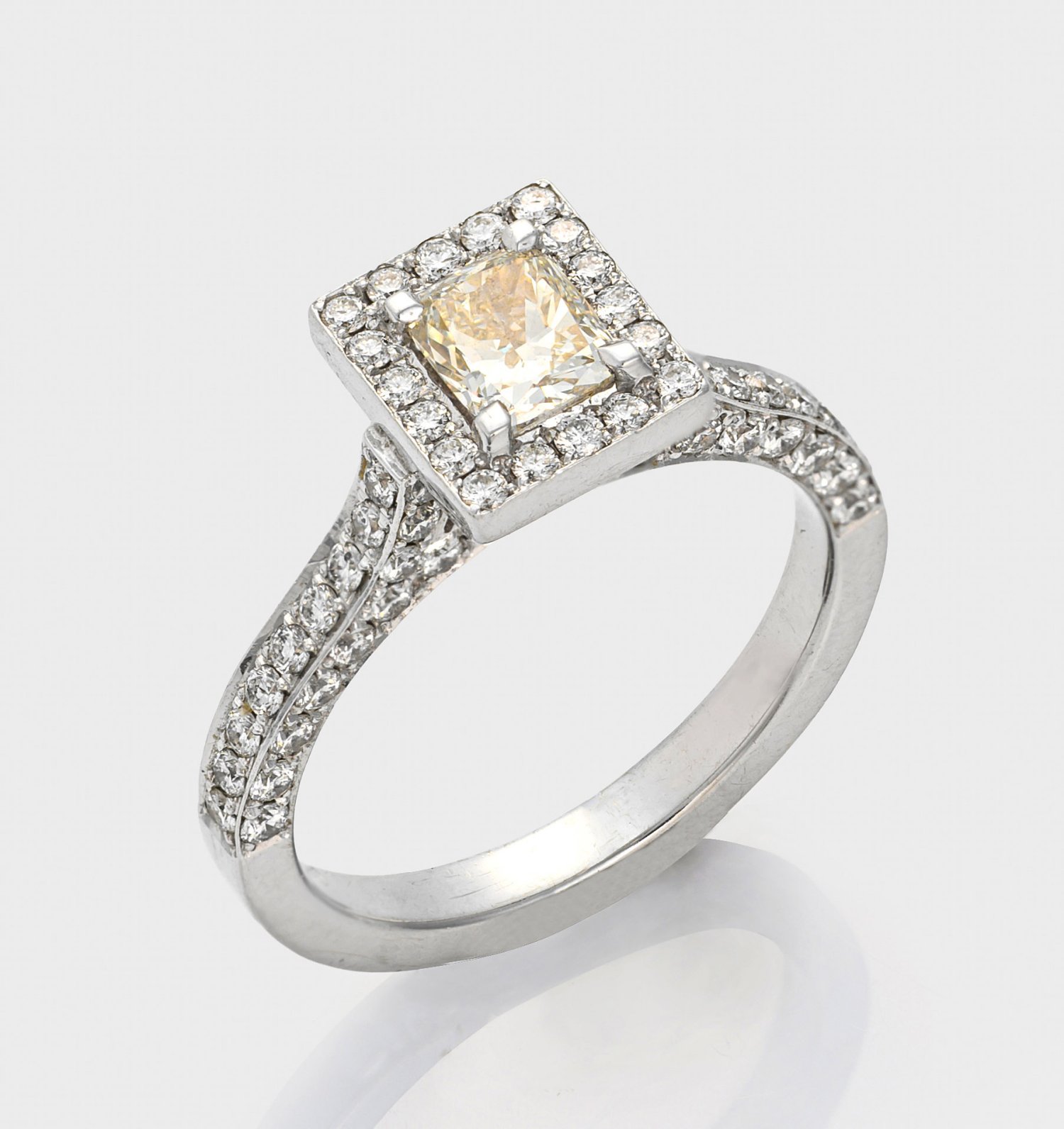 Weißgold, gest. 750. Zentral besetzt mit einem Diamanten von ca. 1,02 ct. (I/if-vvs) im Princess Bezel Corner-Schliff, entouriert von kleinen Brillanten von zus. ca. 1,50 ct. (D-F/if-vvs). Gew. ca. 5,86 g.