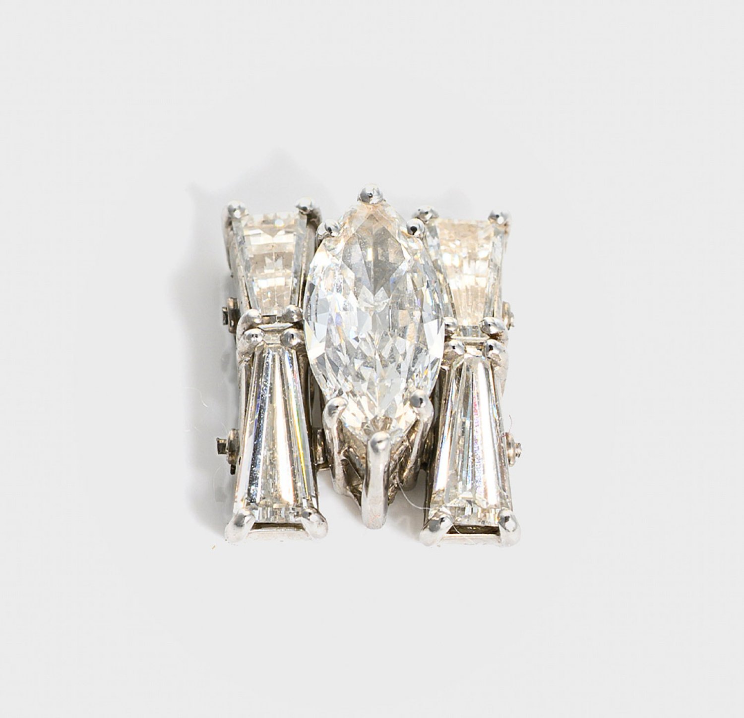 Weißgold, 18 ct.; Zentral besetzt mit einem Diamanten von ca. 0,85 ct. (H/si1) im Marquiseschliff, flankiert von 4 Diamant-Trapezen von zus. ca. 1,20 ct. (G/vvs). Gew. ca. 3,66 g.