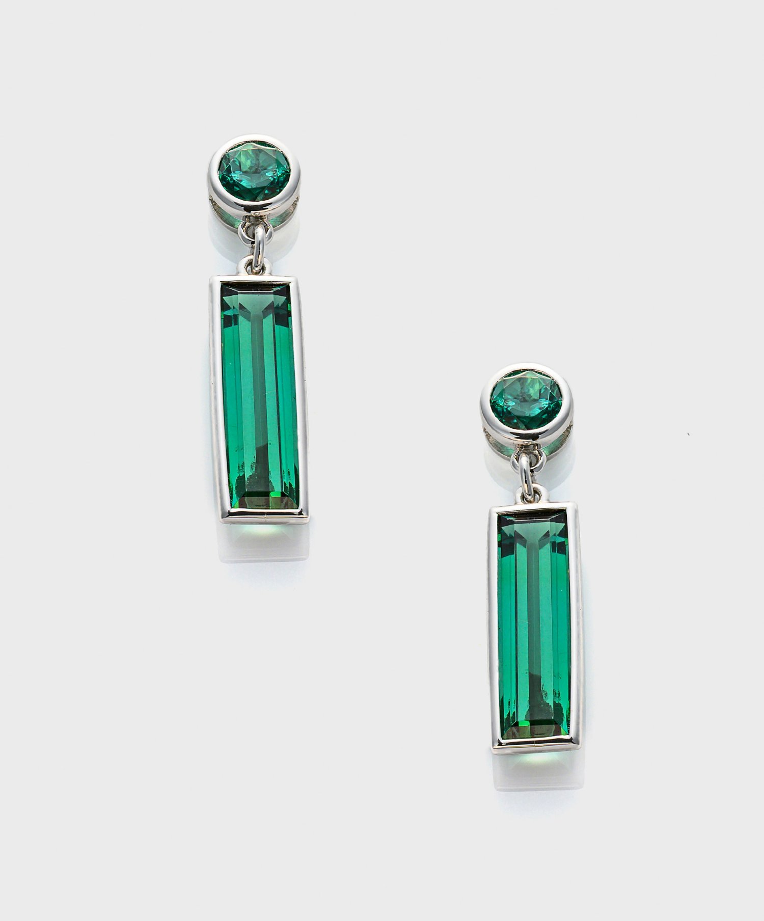 Pair of earrings set with bottle green tourmalines approx. 5,90 ct., in 18 k white gold.