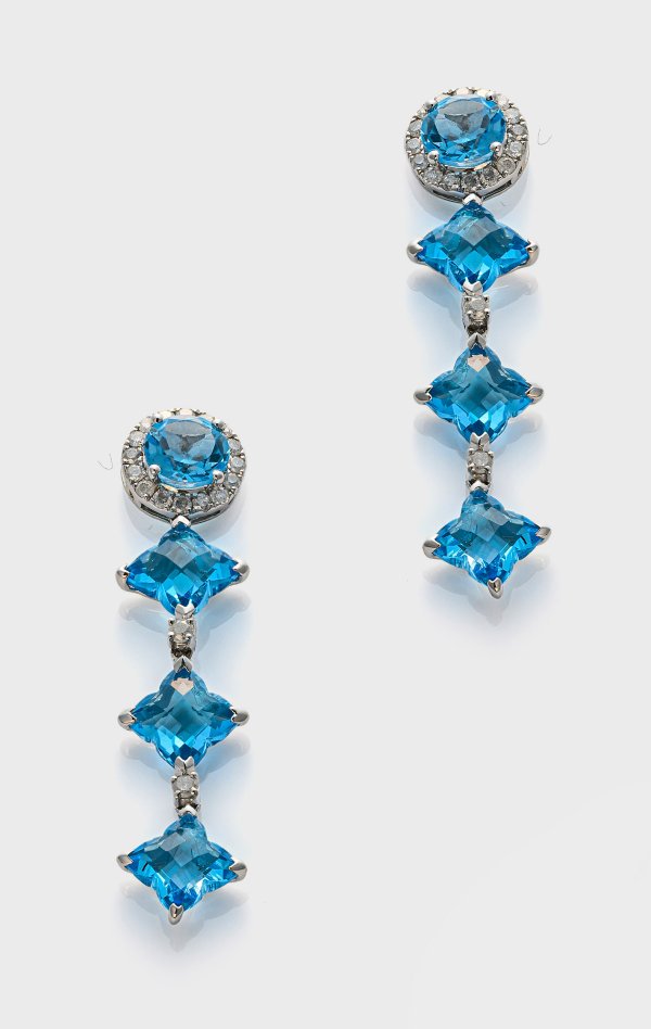 Pair of earrings set with sky blue topazes approx. 8,10 ct. and diamonds approx. 0,46 ct., in 18 k white gold.
