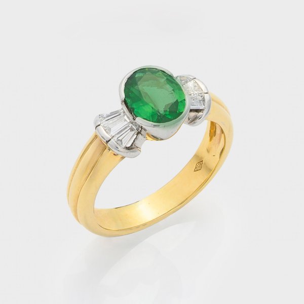 Weißgold, gest. 750. Zentral besetzt mit einem funkelnd grünen Chrom-Turmalin von ca. 0,97 ct., flankiert von Diamant-Trapezen von zus. ca. 0,43 ct. (H/si). Gew. ca. 5,87 g.