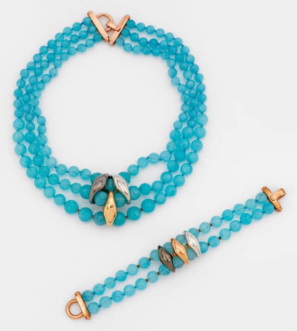 Necklace and bracelet by GIADIN, set with sky blue aquamarine pearls, clasp in silver. Manufacturer's mark.